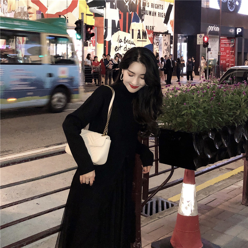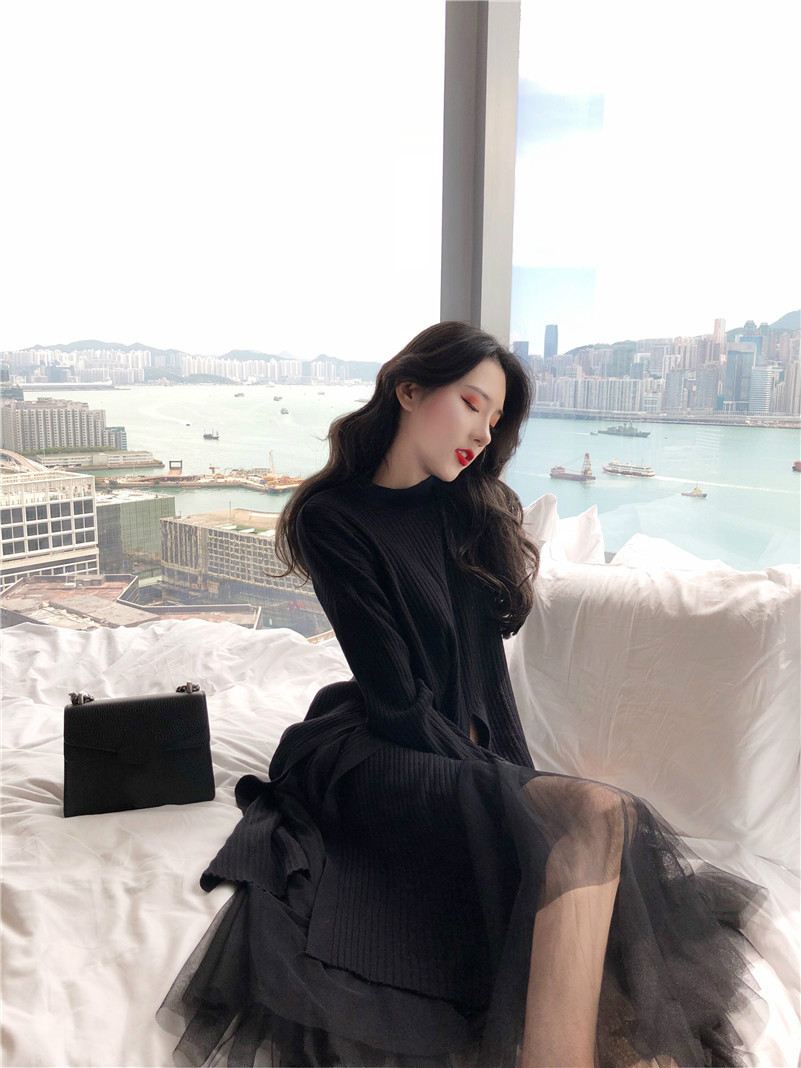 新款開叉套頭長款長袖毛衣外套網紗不規則半身仙女紗裙時尚套裝潮