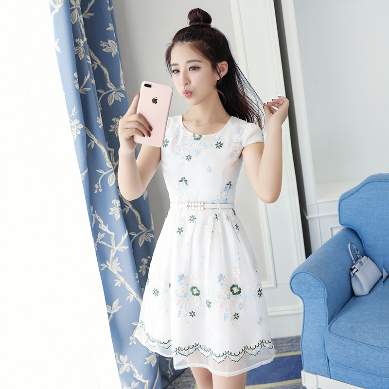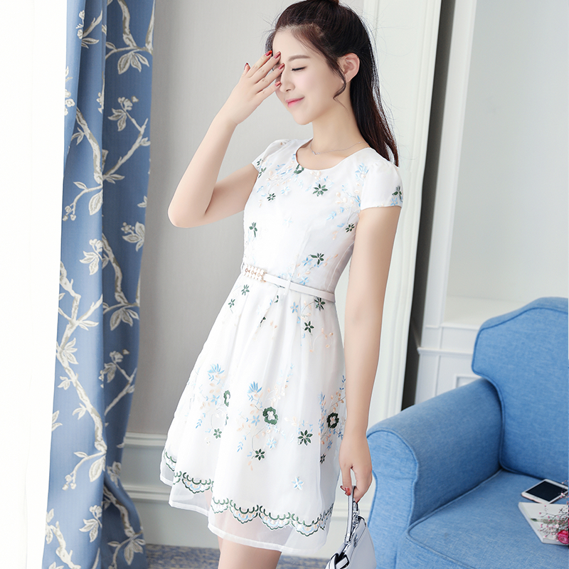 / 夏裝新款時尚短袖韓版A字裙 收腰小清新中長款歐根紗連衣裙女