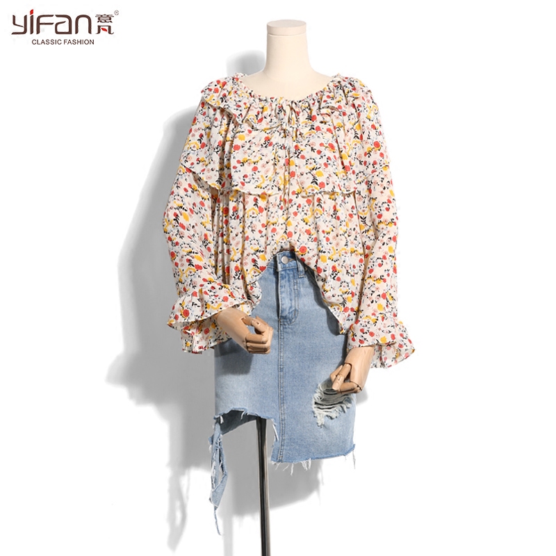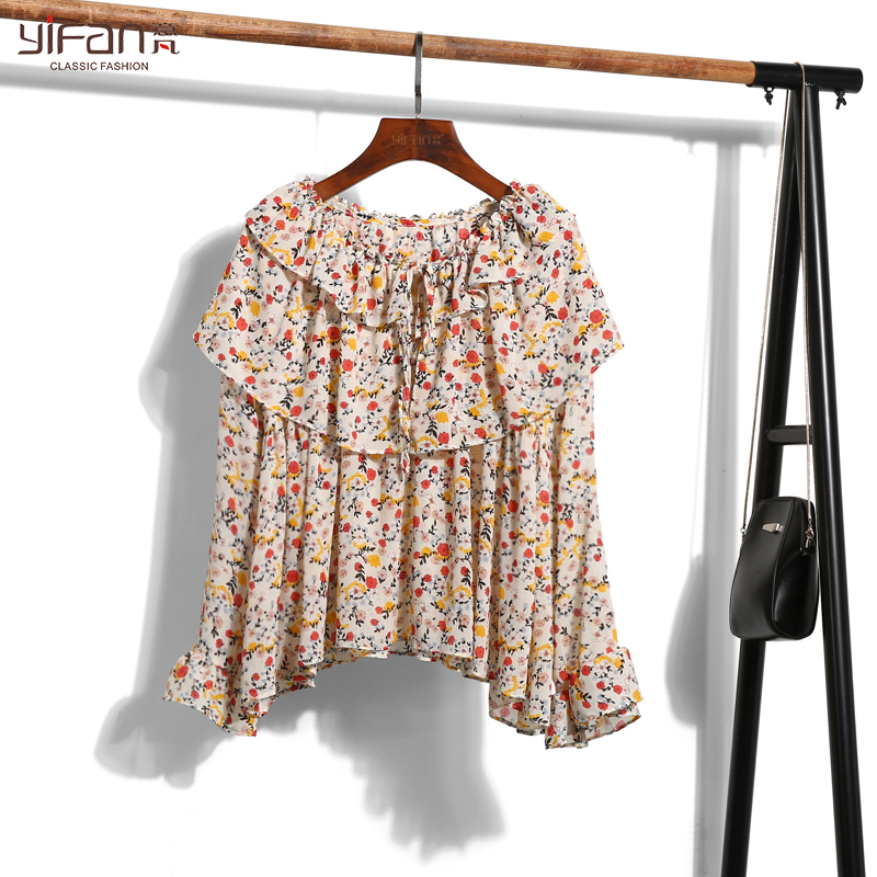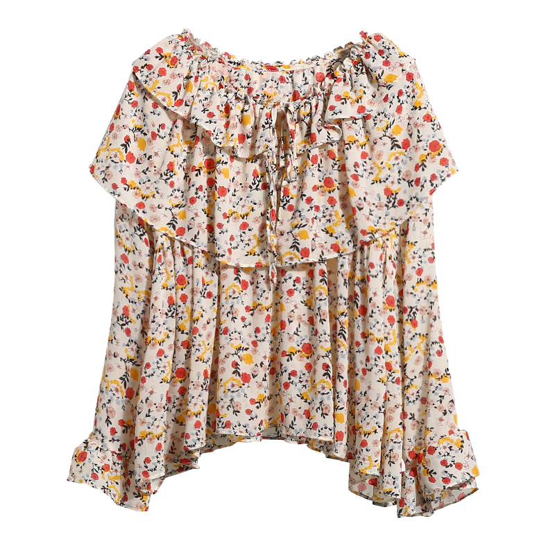 / 春夏韓版百搭氣質碎花系帶娃娃衫喇叭袖雪紡上衣女荷葉邊長袖