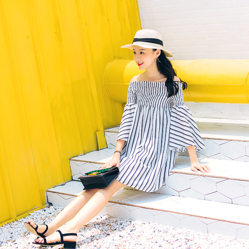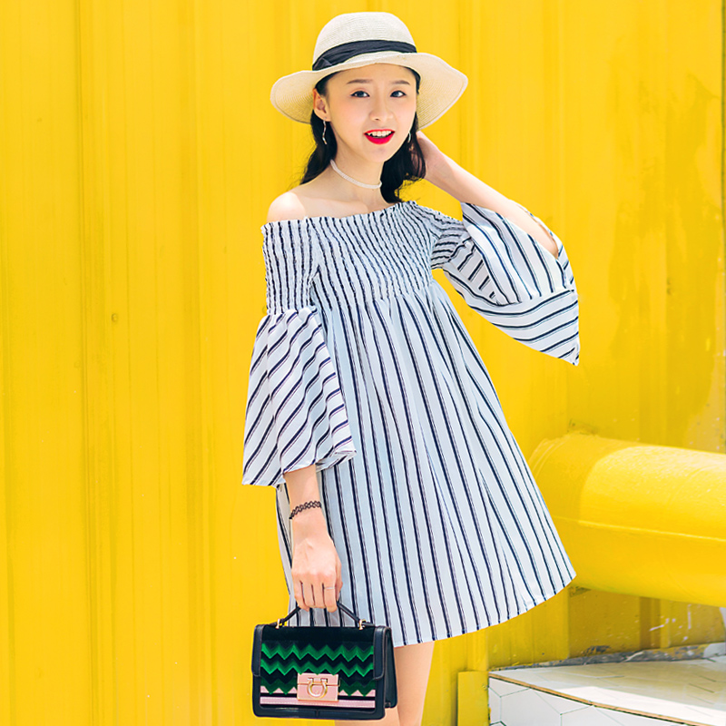 一字領露肩條紋連衣裙夏裝新款女裝韓版學生小清新喇叭袖裙子