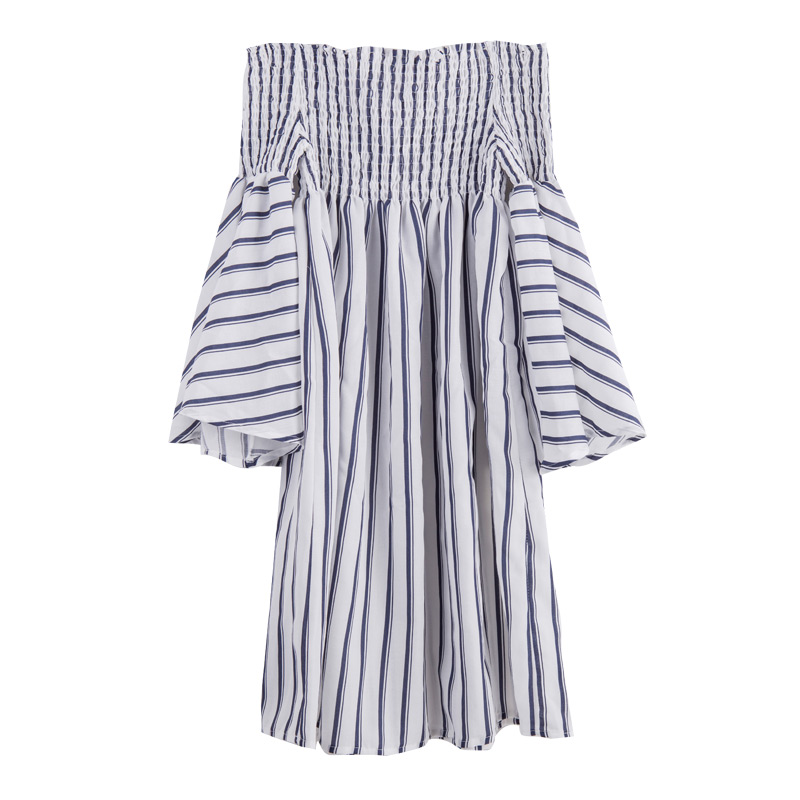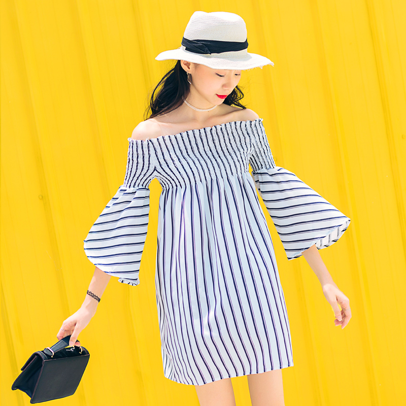 / 一字領露肩條紋連衣裙夏裝新款女裝韓版學生小清新喇叭袖裙子