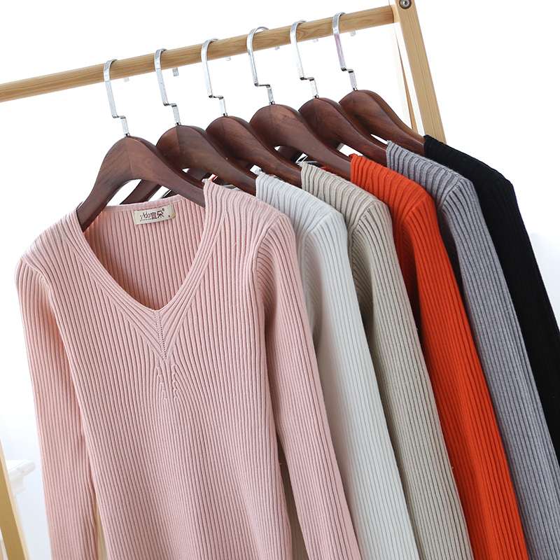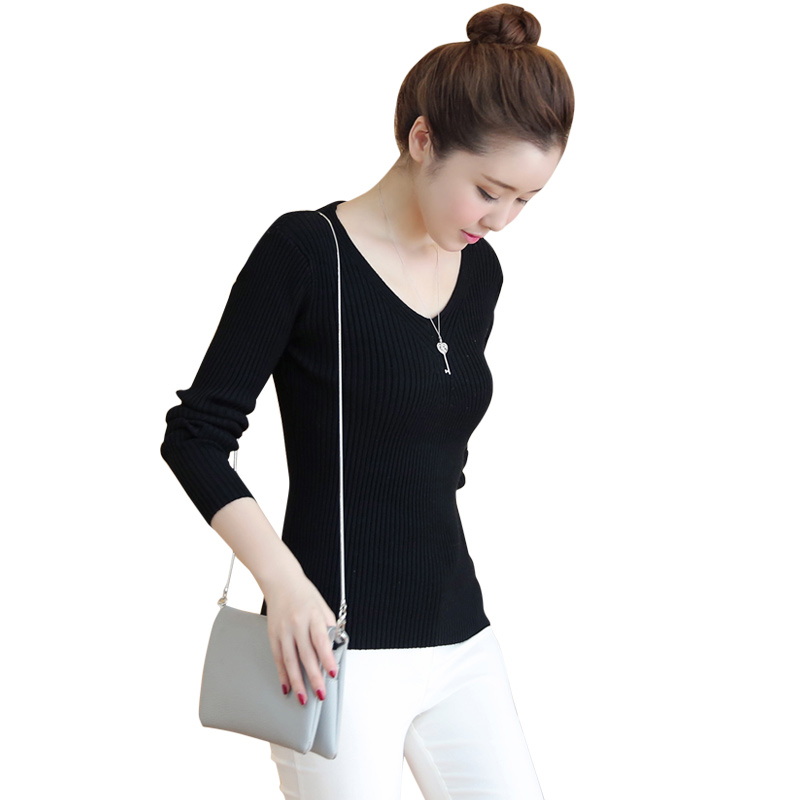 / 黑色打底毛衣女短款秋冬v領套頭針織打底衫女春季修身長袖針織衫
