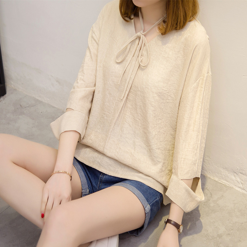 / 夏裝新款女韓版寬松系帶白色t恤女打底女長袖體恤衫上衣女潮
