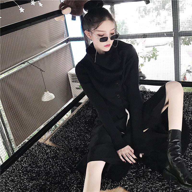 / 新款韓版秋季時尚套裝堆堆領單排扣長袖針織上衣不規則抽繩半身裙