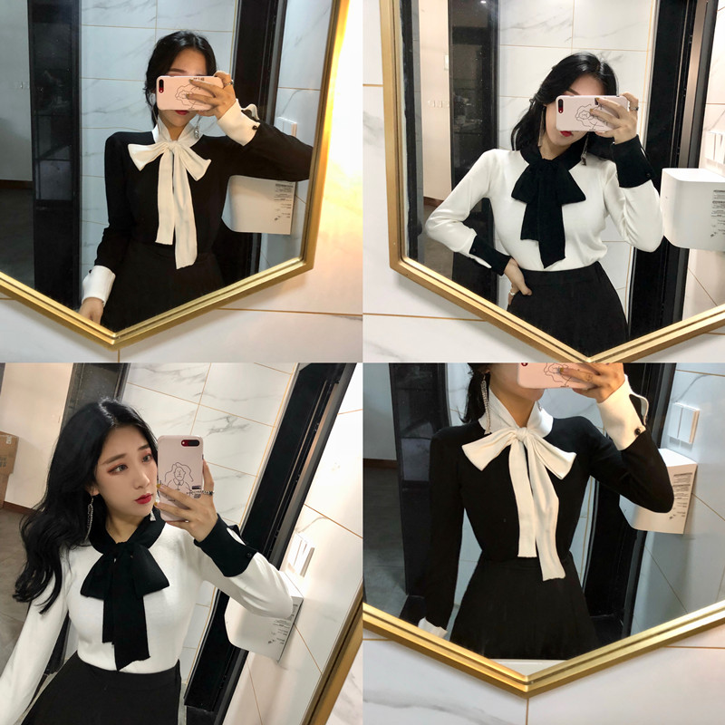 秋裝新款修身復古chic韓版氣質百搭撞色圍巾領針織衫女打底上衣潮