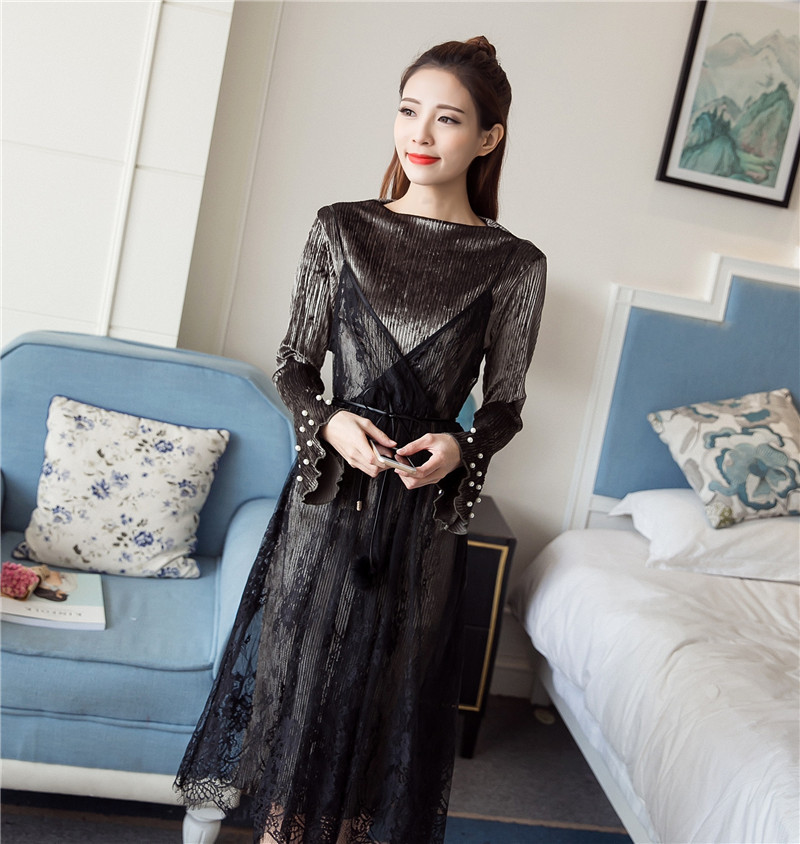 / 早春新款女裝蕾絲中長吊帶裙氣質釘珠喇叭袖絲絨連衣裙兩件套