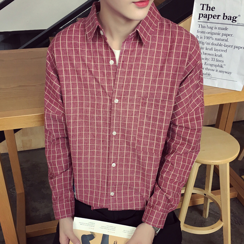 / 春裝新款韓版細格子休閑青年百搭男士長袖襯衫襯衣