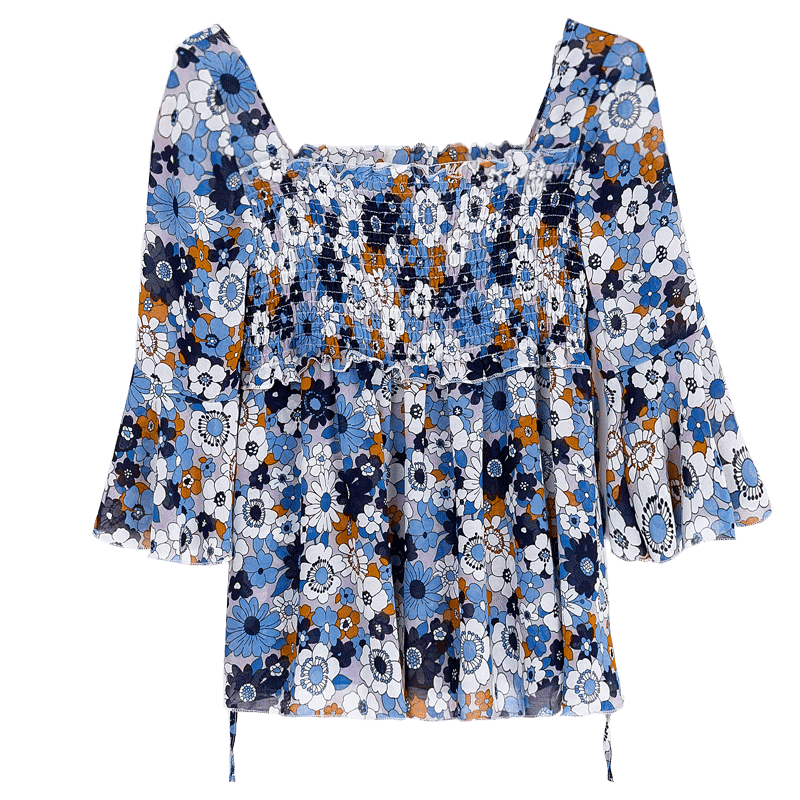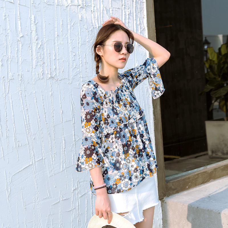 夏裝新款女裝韓版時尚印花喇叭袖雪紡衫學院風露背半袖上衣潮