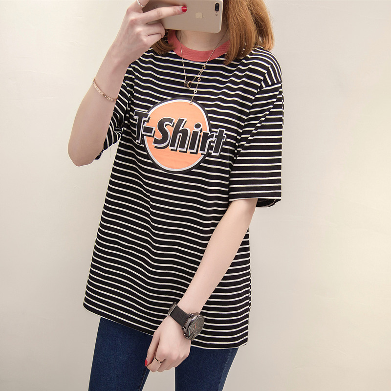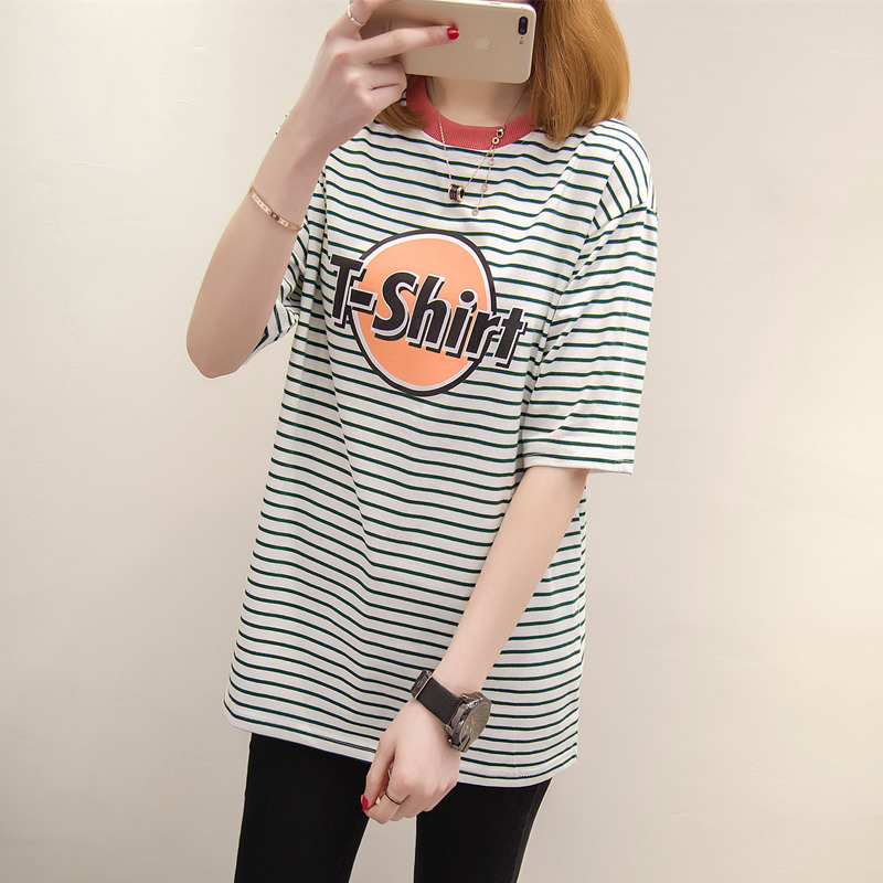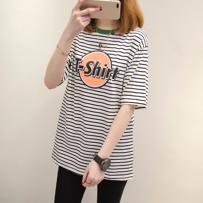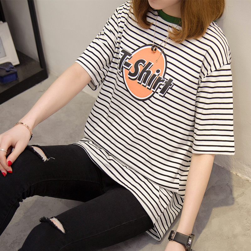 / 條紋短袖t恤女字母印花新款韓版寬松中長款體恤衫夏裝新款女