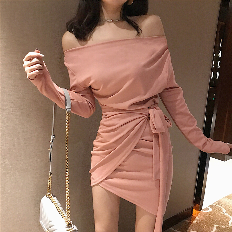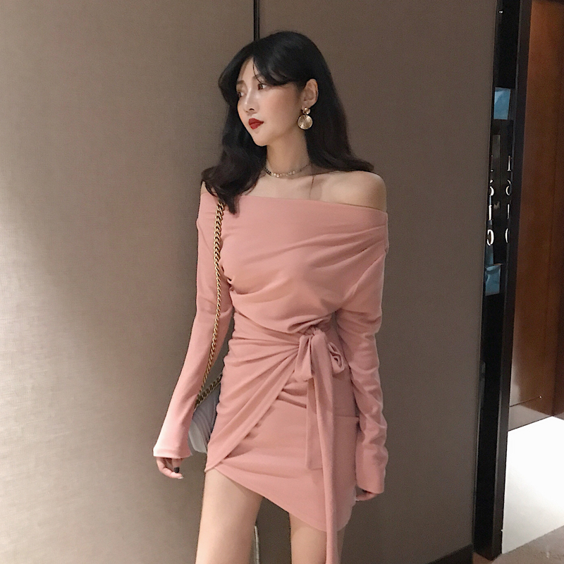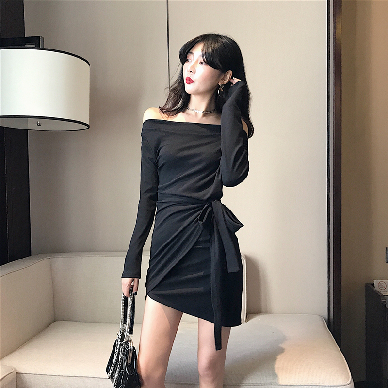 / 小心機新款韓版秋季女裝短裙百搭修身顯瘦不規則綁帶露肩連衣裙潮