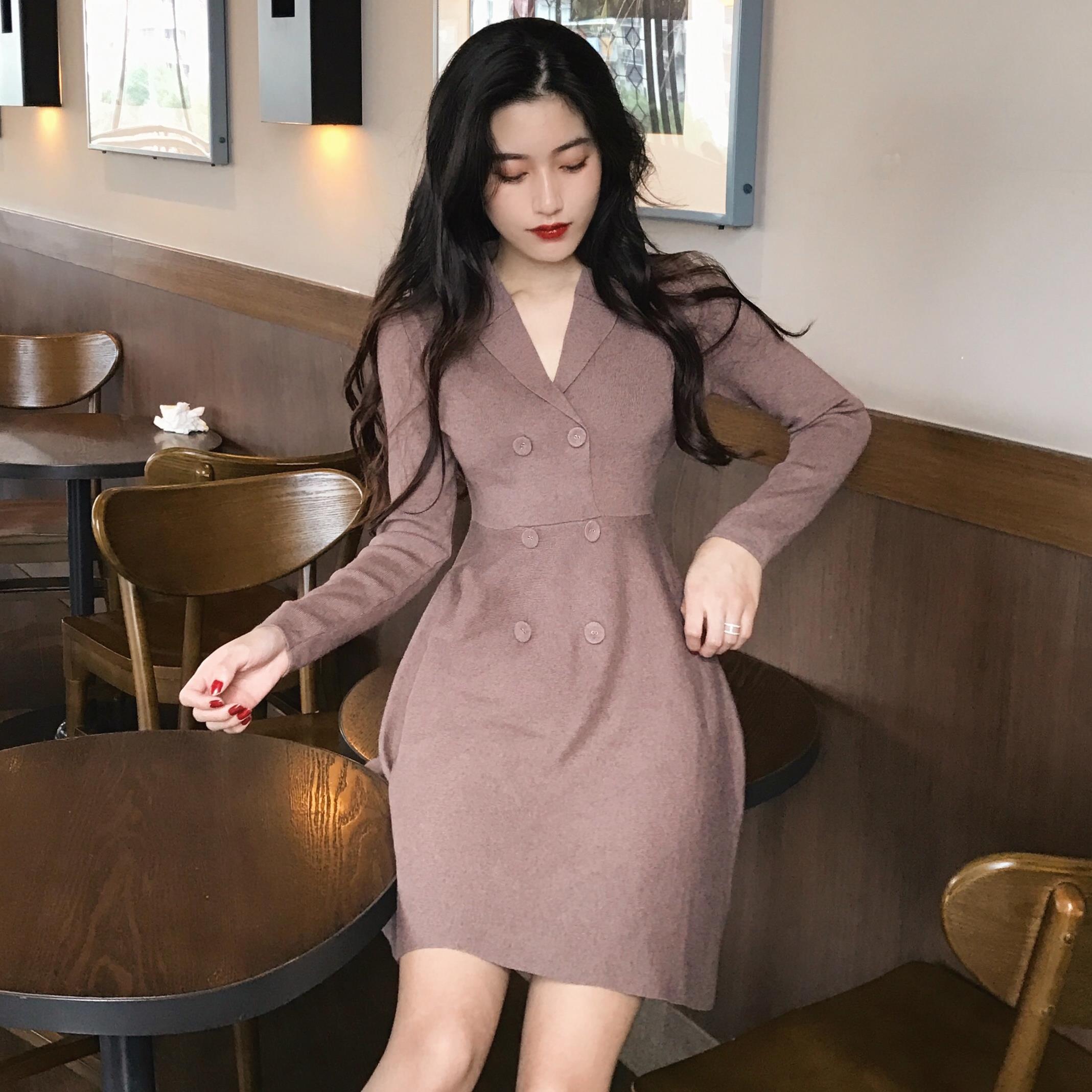 / 新款韓版chic百搭簡約甜美氣質A字裙修身顯瘦小翻領高腰連衣裙女