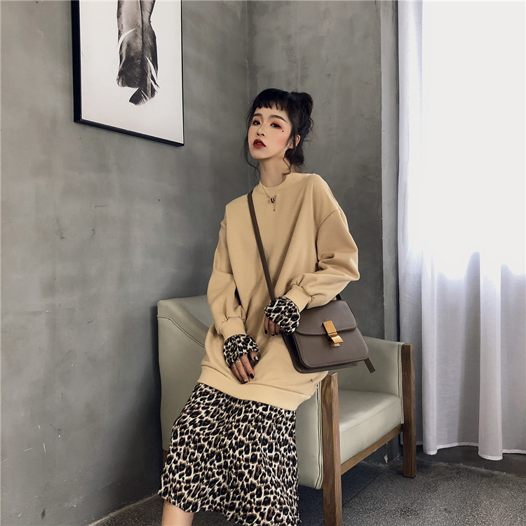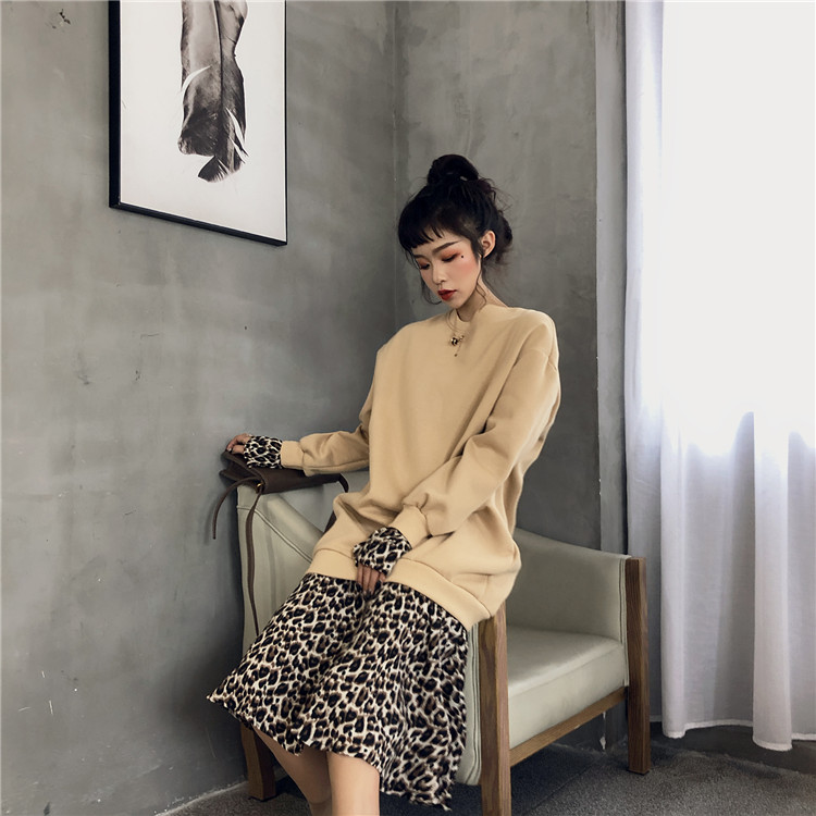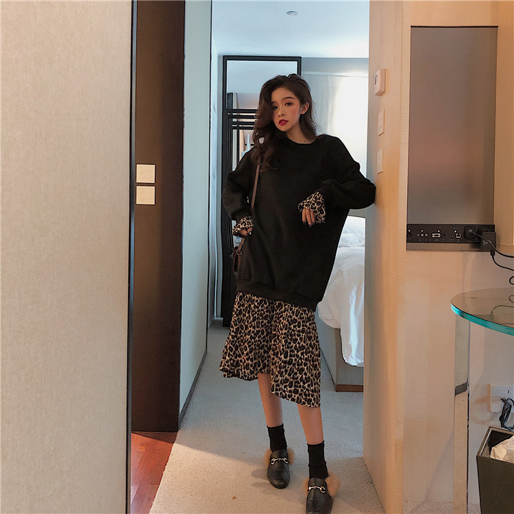 / 復古港風加絨百搭圓領中長裙新款韓版秋冬假兩件拼接豹紋連衣裙女