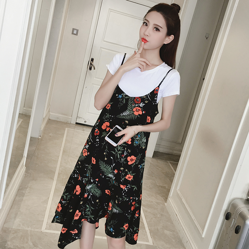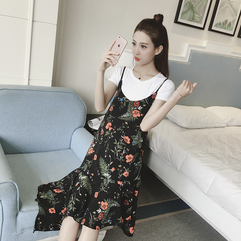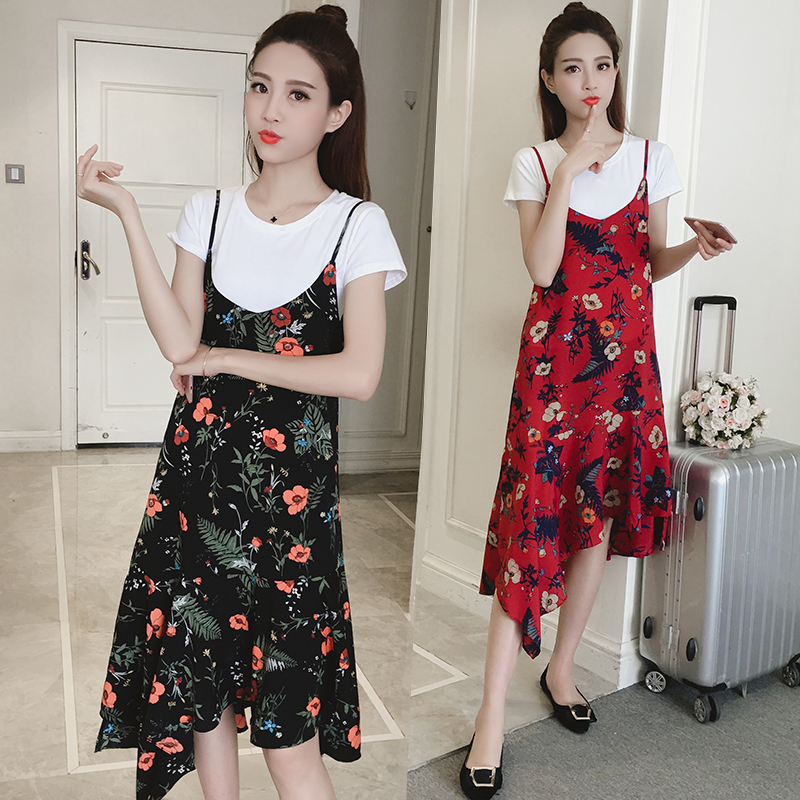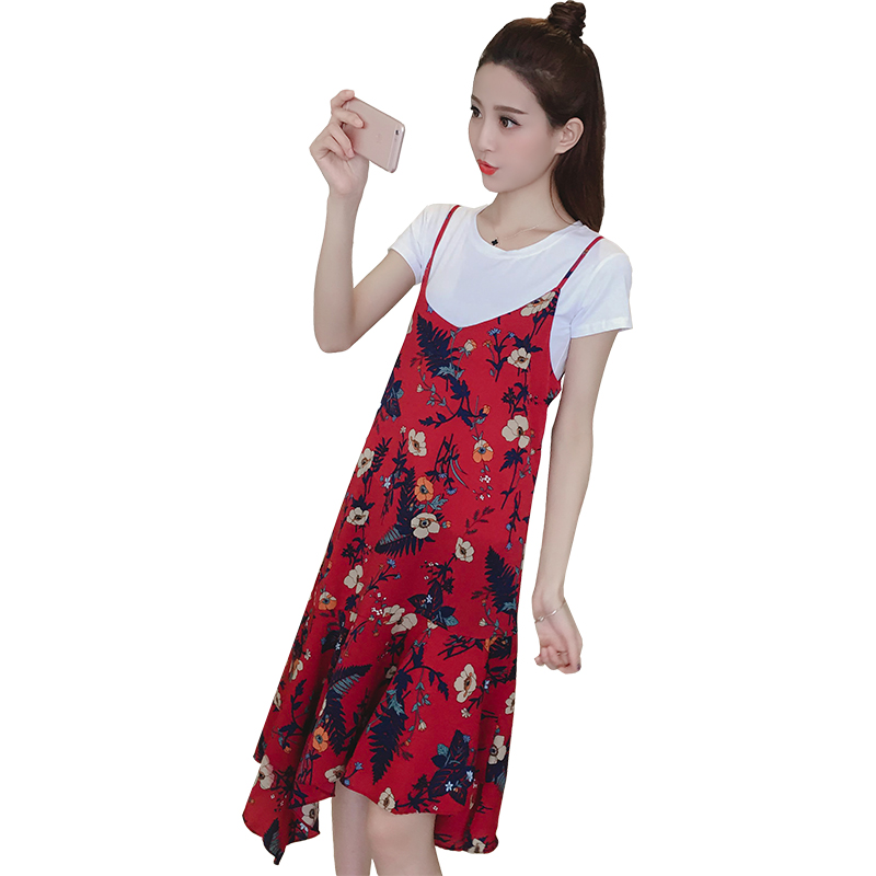 / 新款女裝復古中長款不規則下擺寬松顯瘦碎花雪紡吊帶連衣裙夏