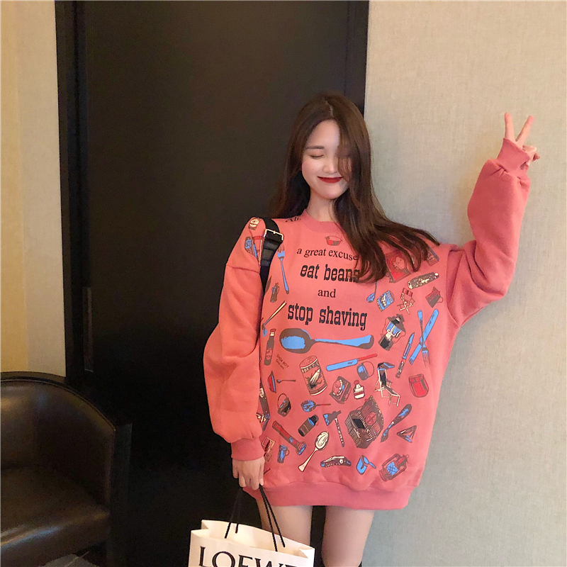 / 港風新款韓版百搭上衣寬松滿幅印花字母圖案圓領套頭加絨時尚衛衣