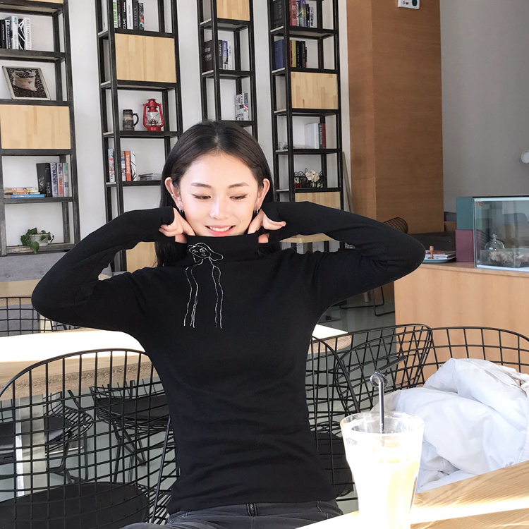 秋冬韓版半高領修身顯瘦女人印花純色長袖T恤打底衫女裝上衣
