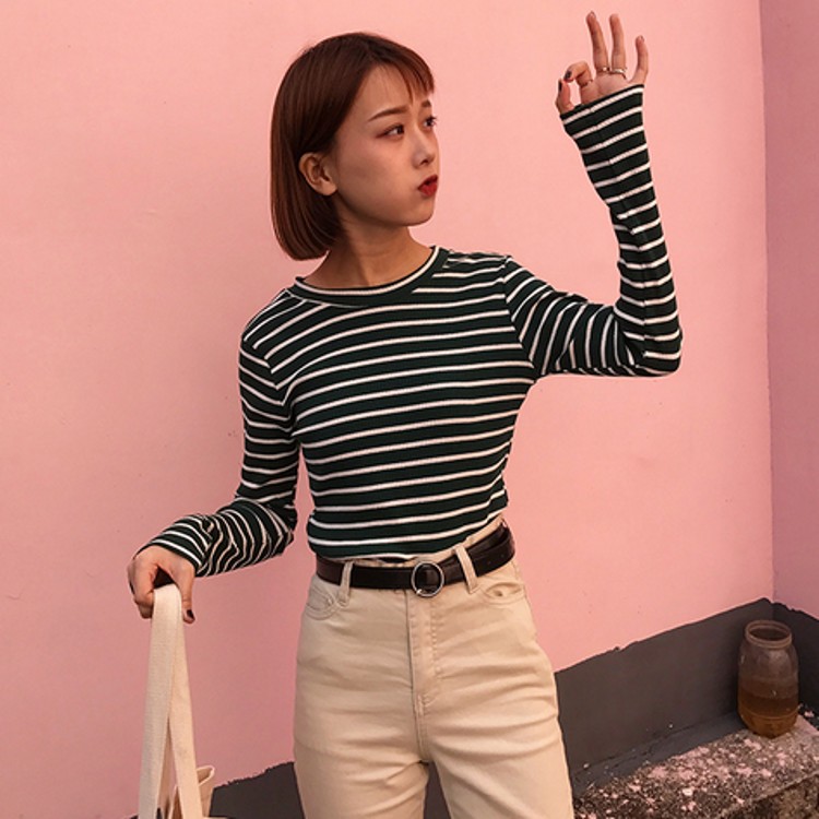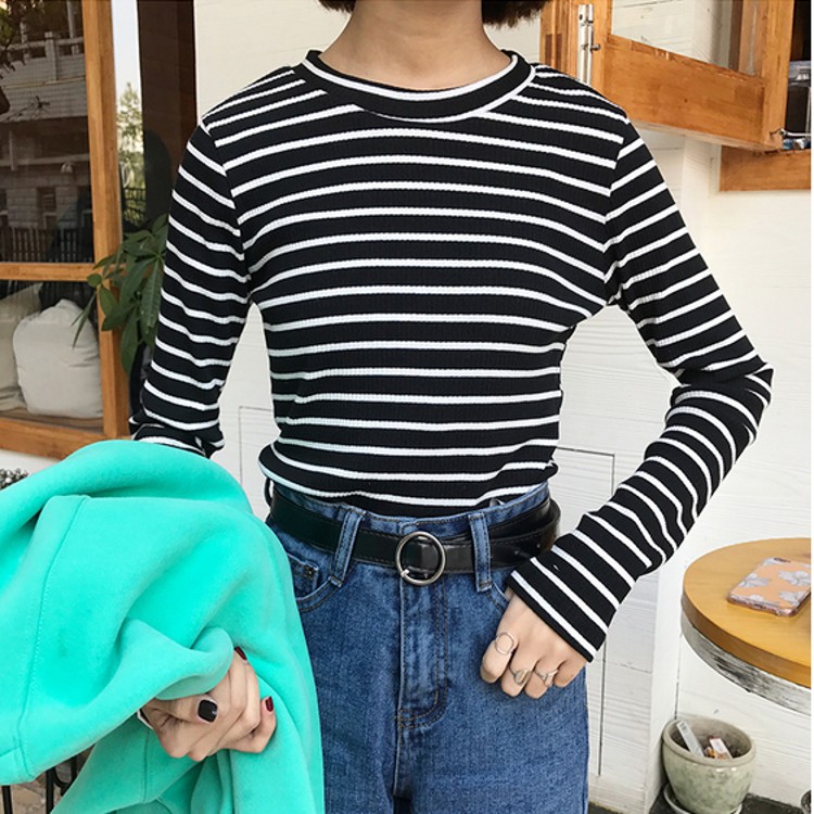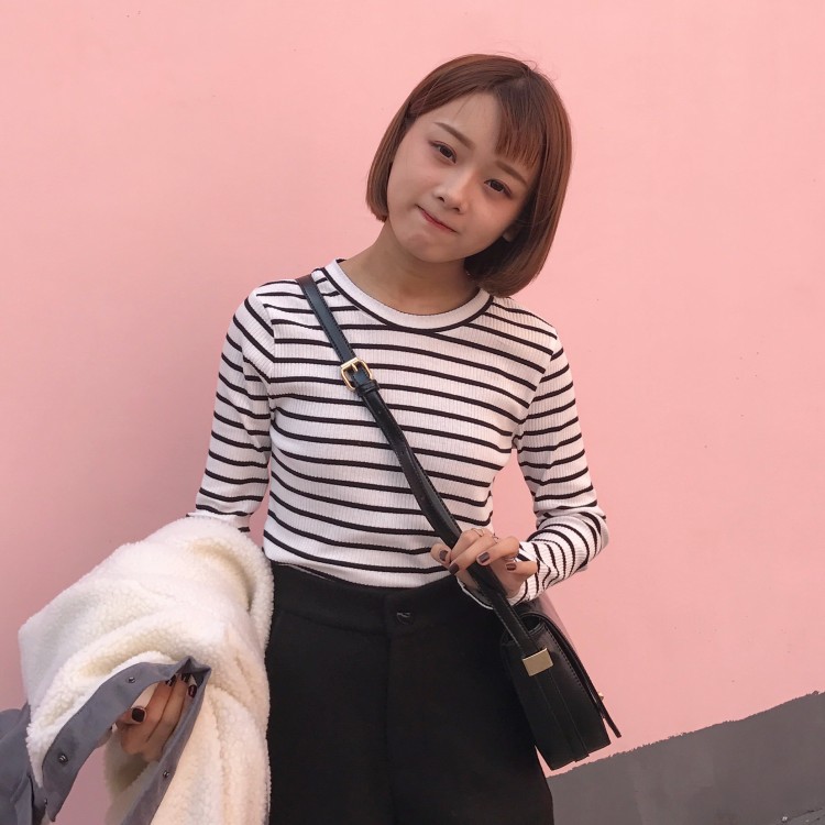 撞色條紋 圓領的款 很顯脖子長哦
