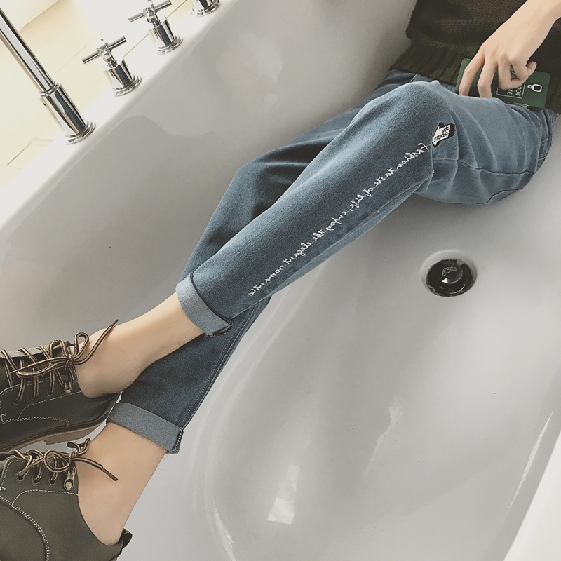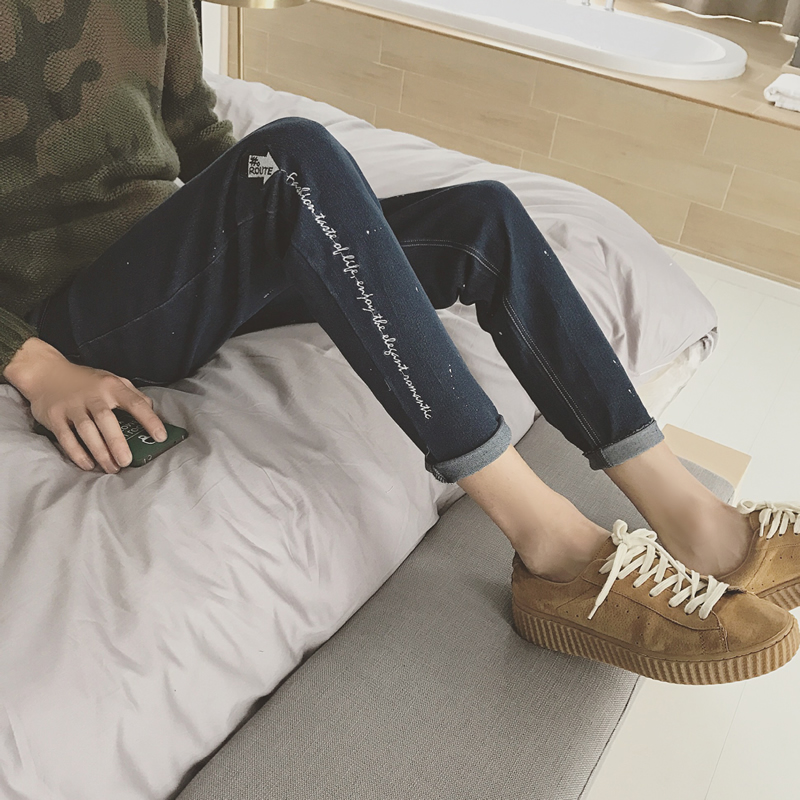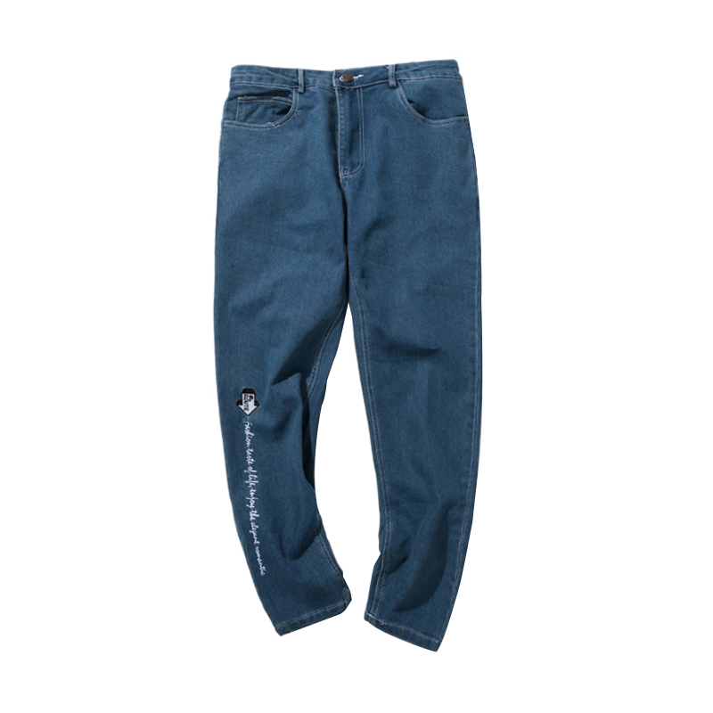 / 秋冬新款韓版修身褲腳刺繡休閑牛仔褲男修身小腳褲