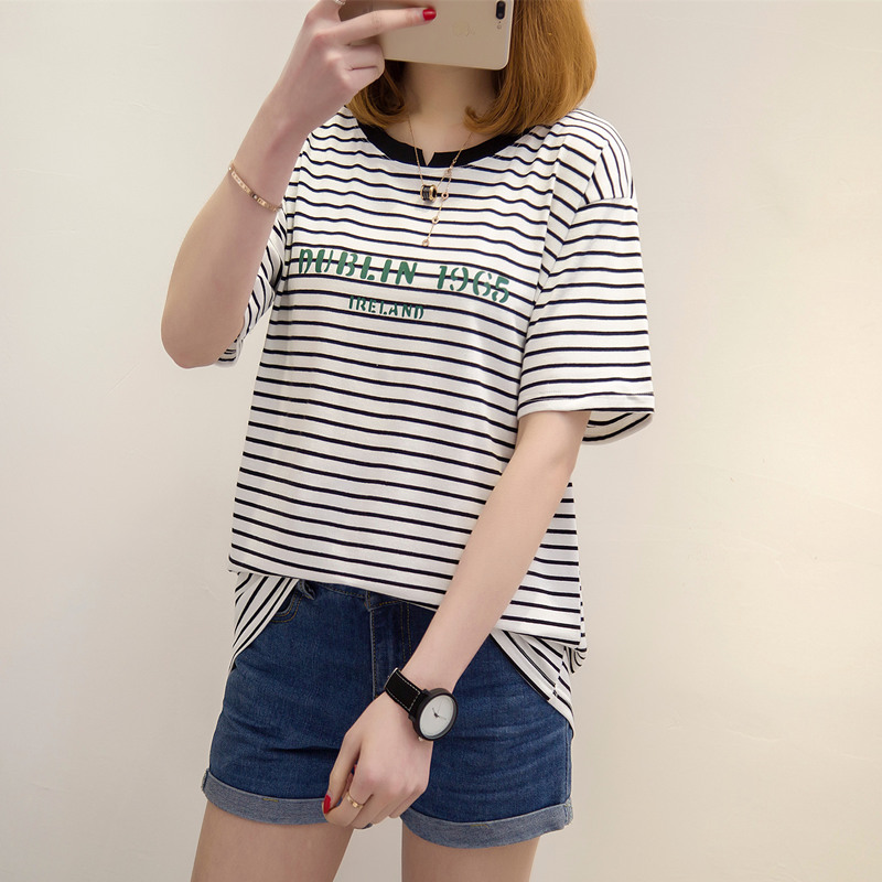 / 條紋短袖t恤女夏裝新款女裝韓版體恤衫寬松打底休閑上衣女夏