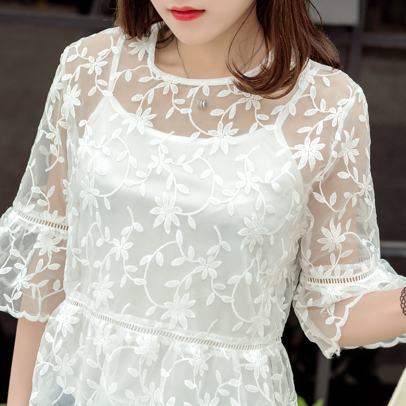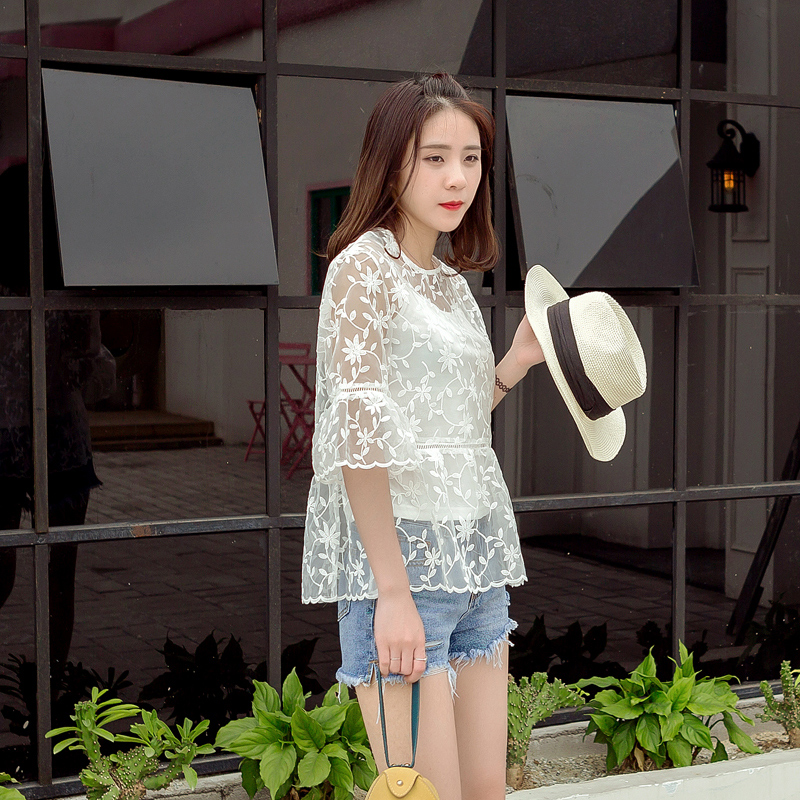 春夏裝韓版新款女裝刺繡網紗蕾絲衫白色學生寬松打底衫上衣潮