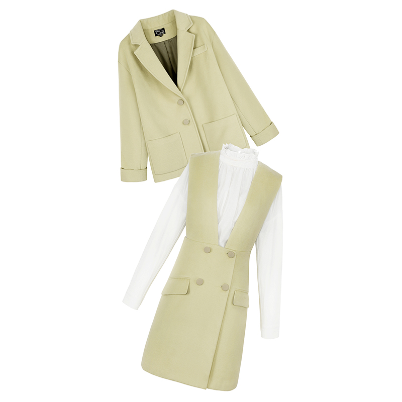 外套-芥末黃|襯衫-白色|背帶裙-芥末黃