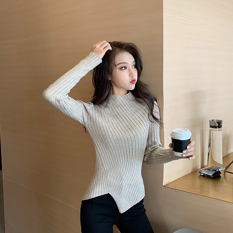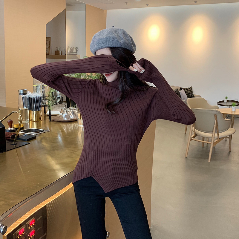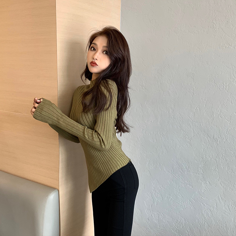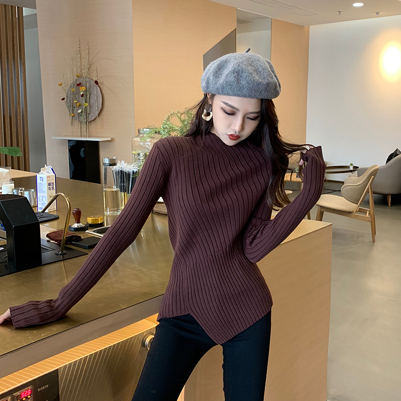 復古chic新款韓版百搭修身顯瘦不規則邊針織打底加厚保暖純色毛衣