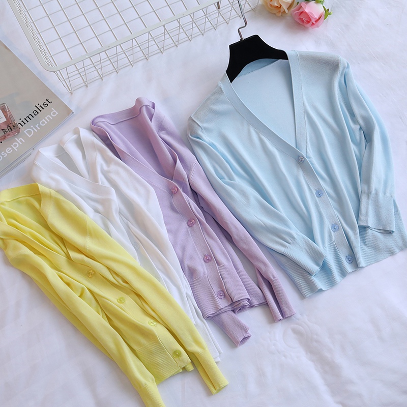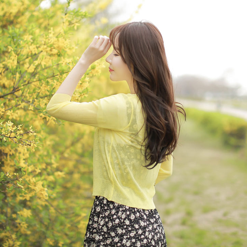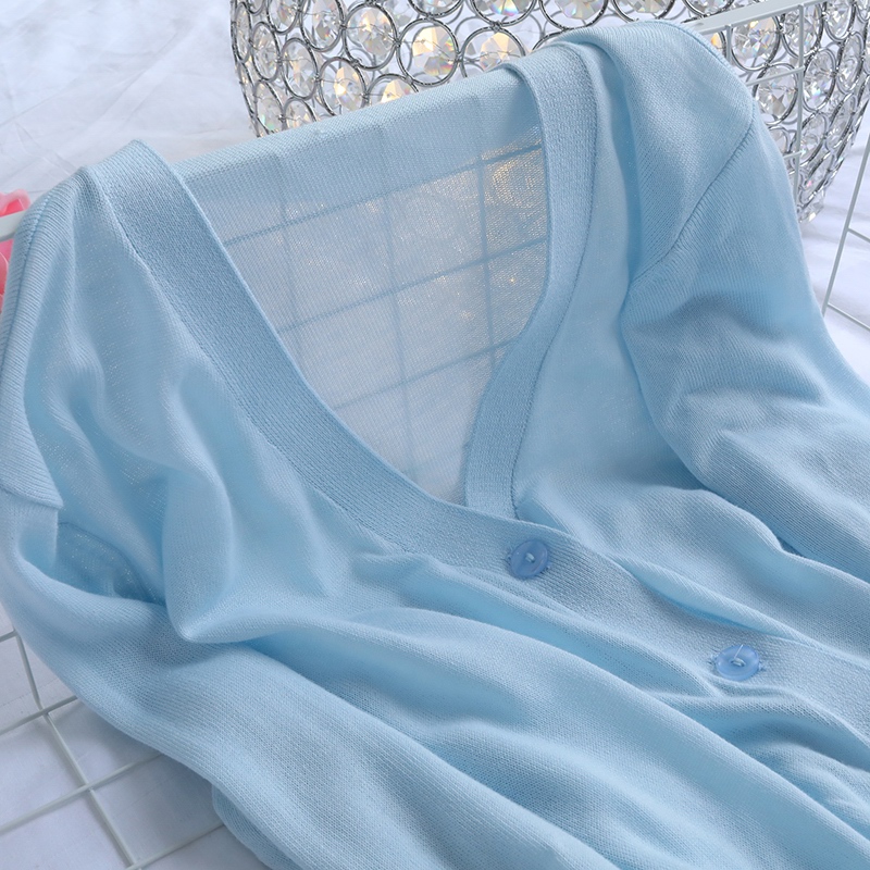 / 冰絲針織開衫女夏季薄款外搭防曬開衫女純色短款七分袖針織衫外套