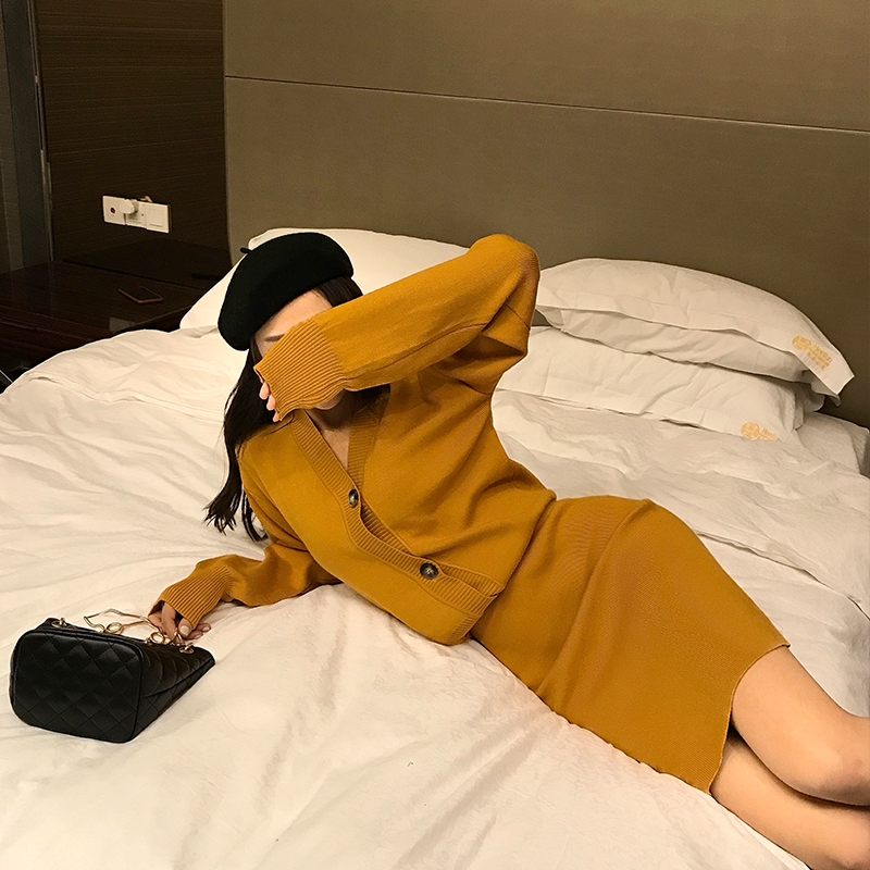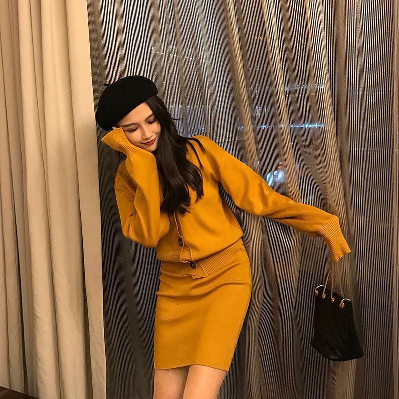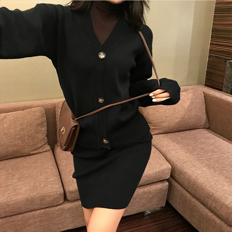 / 2018秋冬新款韓版針織時尚套裝長袖V領開衫高腰包臀短裙兩件套女