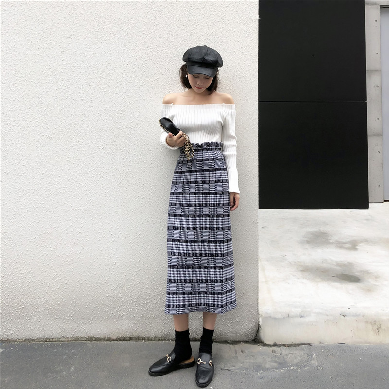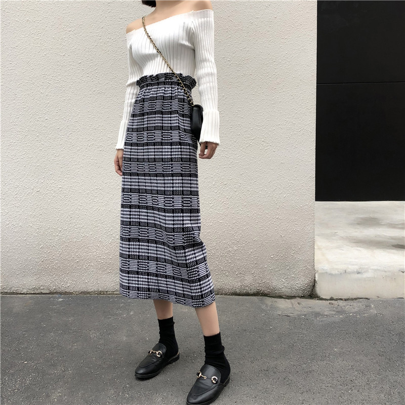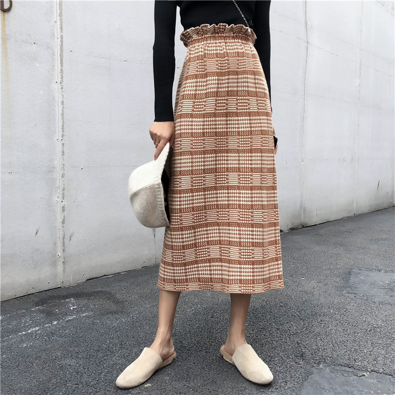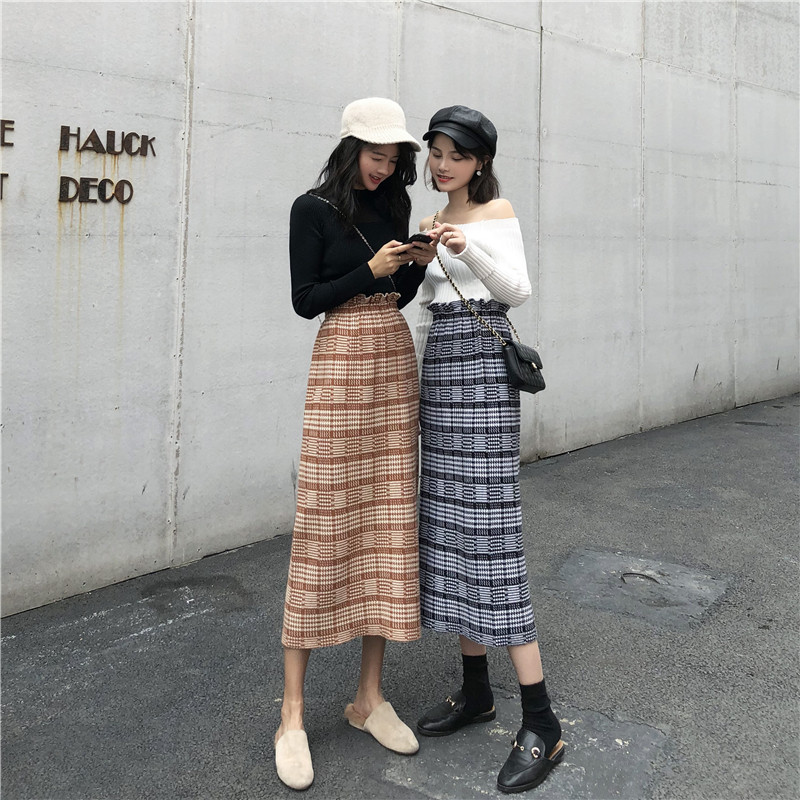 / 2018秋冬新款韓版BF原宿風復古高腰格子半身裙A字裙中長款針織裙