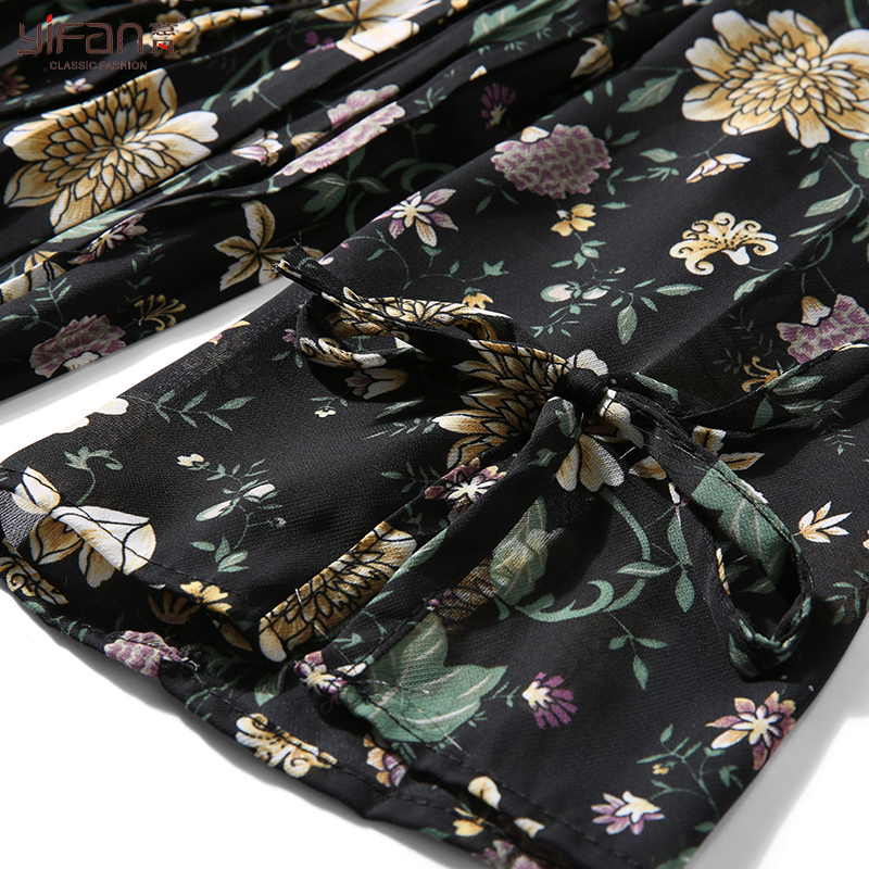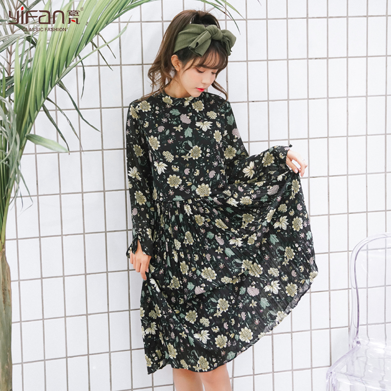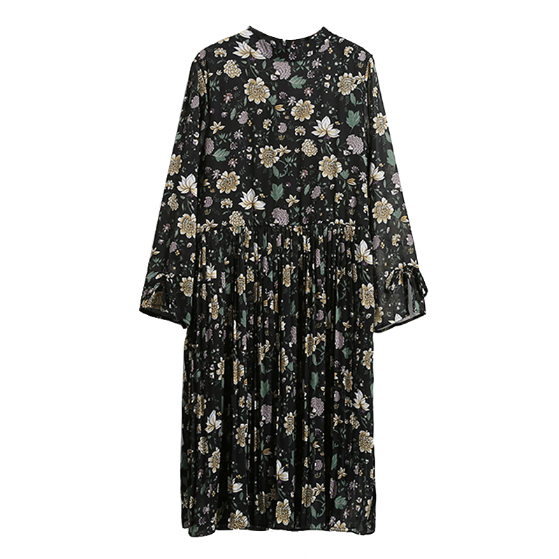 春夏雪紡碎花長款氣質連衣裙女裝韓版喇叭袖長袖百褶打底裙潮
