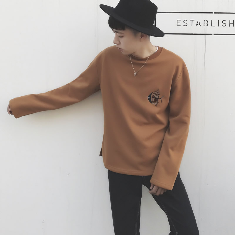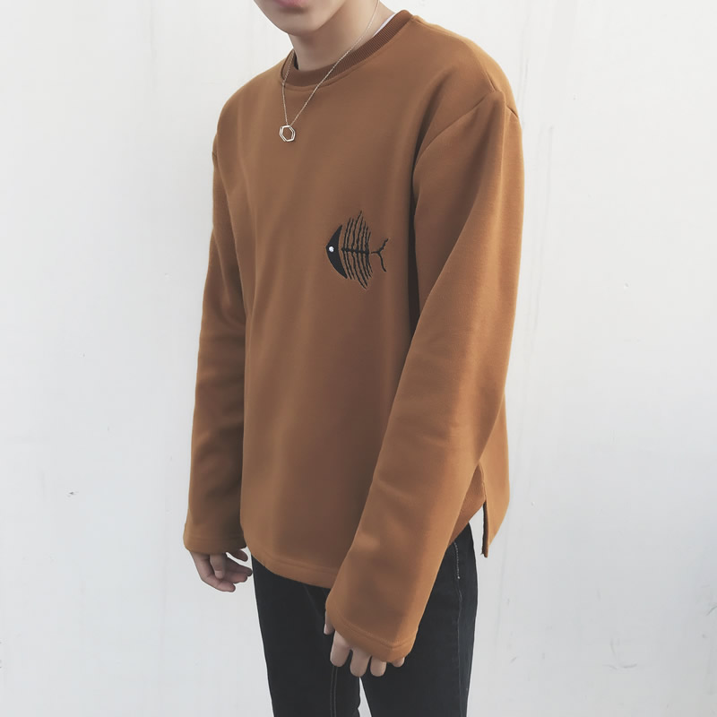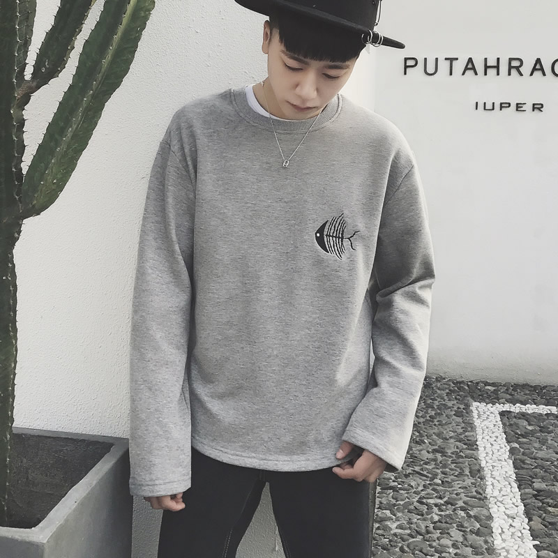 男裝韓版魚骨頭刺繡圓領衛衣春裝男士寬松套頭衛衣