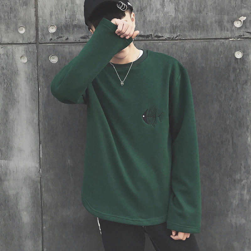 / 男裝韓版魚骨頭刺繡圓領衛衣春裝男士寬松套頭衛衣