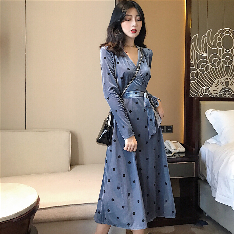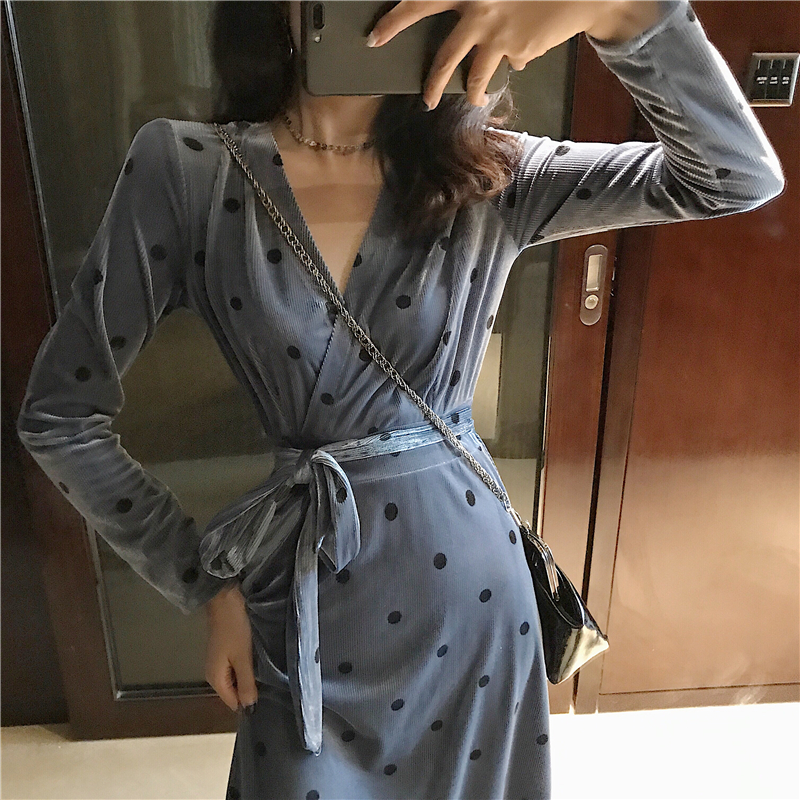晚晚風新款韓版秋季時尚氣質百搭絲絨波點連衣裙綁帶收腰打底裙女