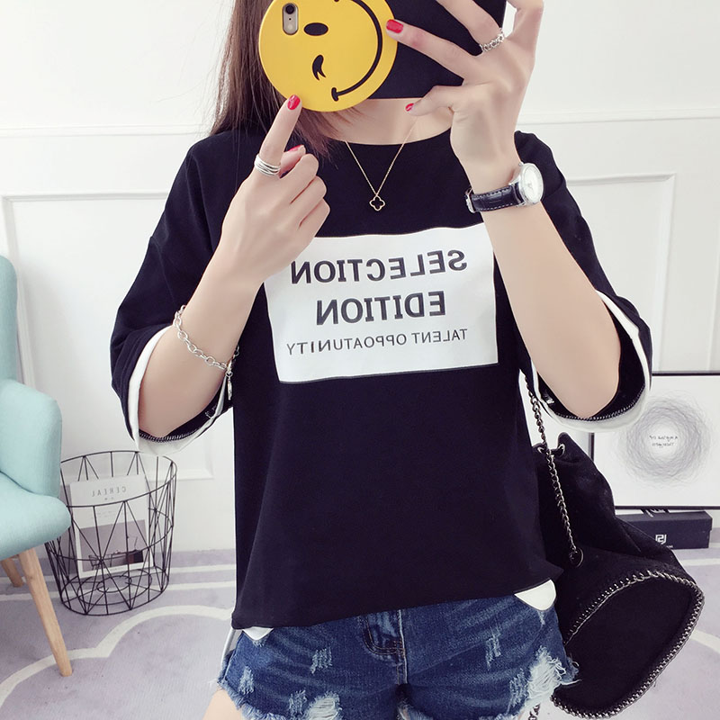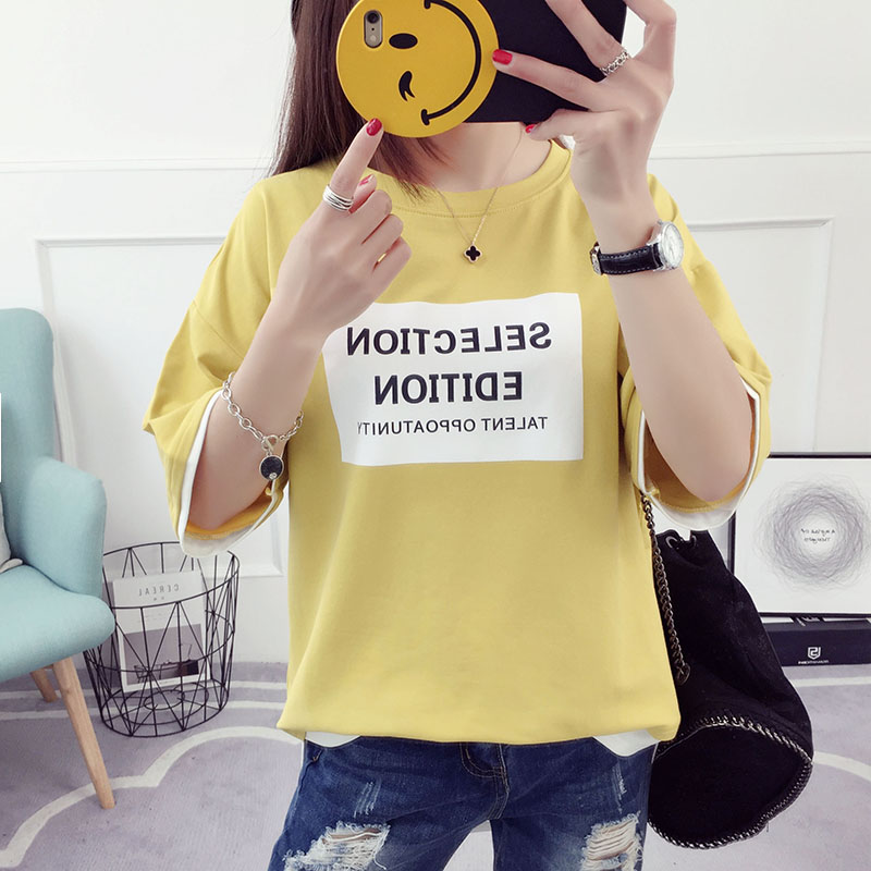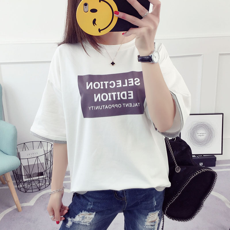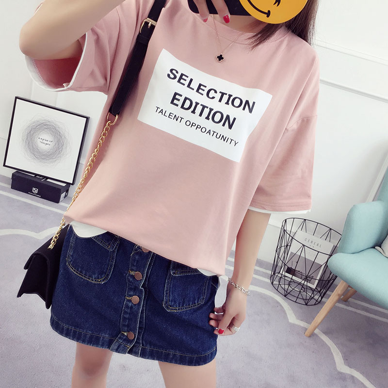 / 中袖t恤女中長款假兩件上衣學生韓版寬松百搭半袖夏新款體恤