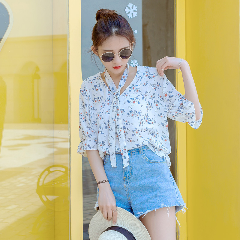 / 雪紡衫女短袖夏季新款甜美系帶碎花襯衫寬松印花打底小衫上衣