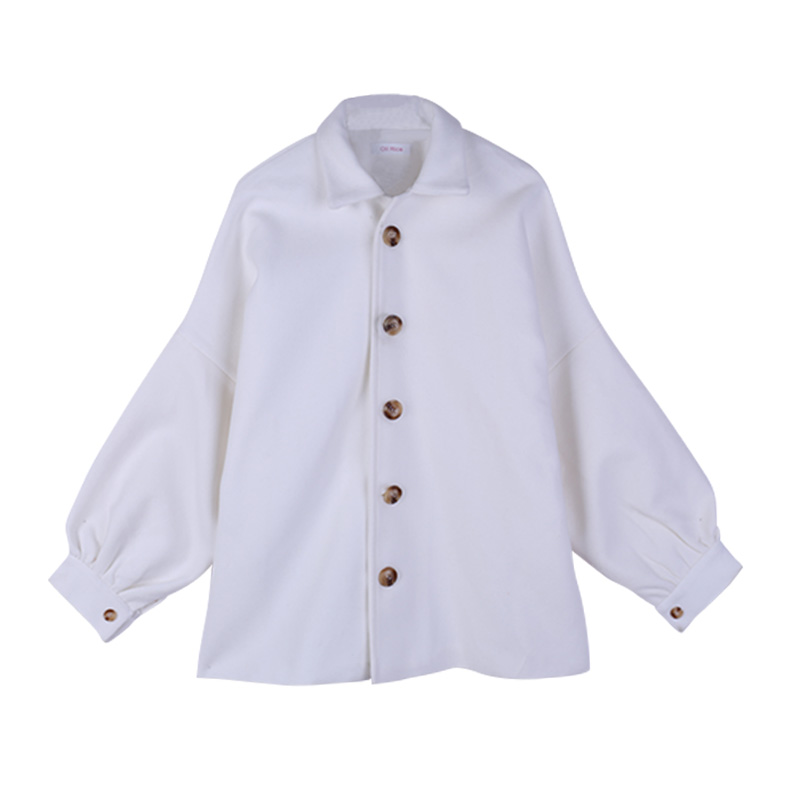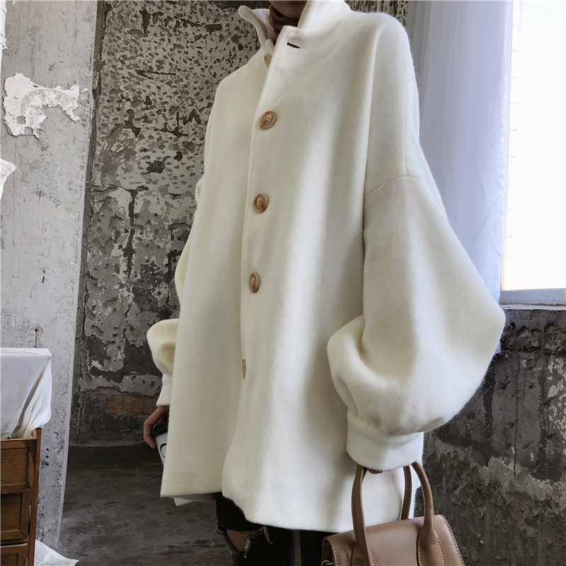 2018新款韓版時尚設計感寬松翻領秋冬復古花苞袖毛呢大衣外套女潮