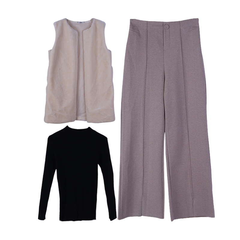 / 新款毛毛長款馬甲百搭打底針織衫上衣高腰闊腿長褲時尚套裝三件套