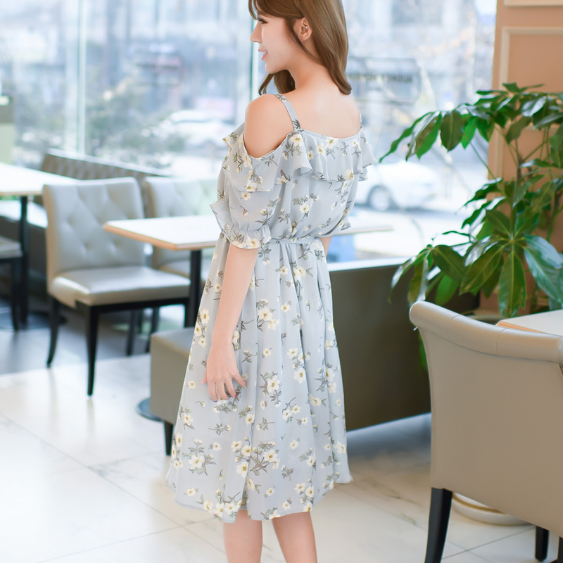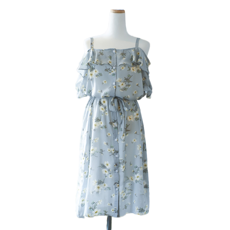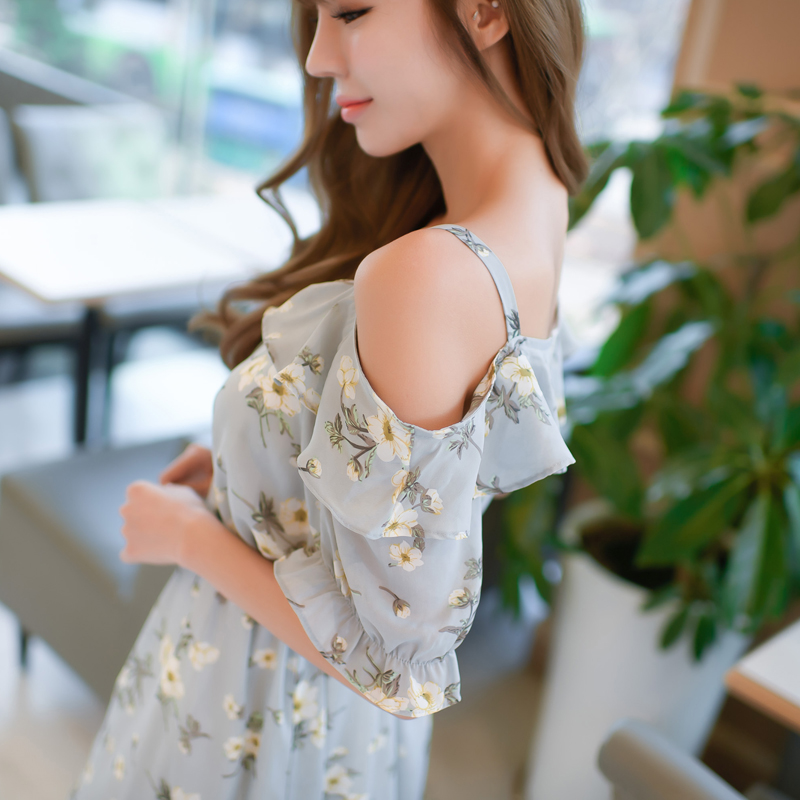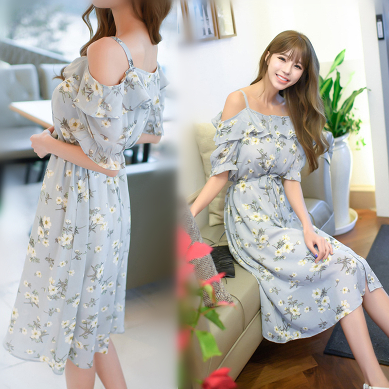/ 韓版新款夏小清新顯瘦雪紡荷葉邊碎花吊帶一字領中長款露肩連衣裙