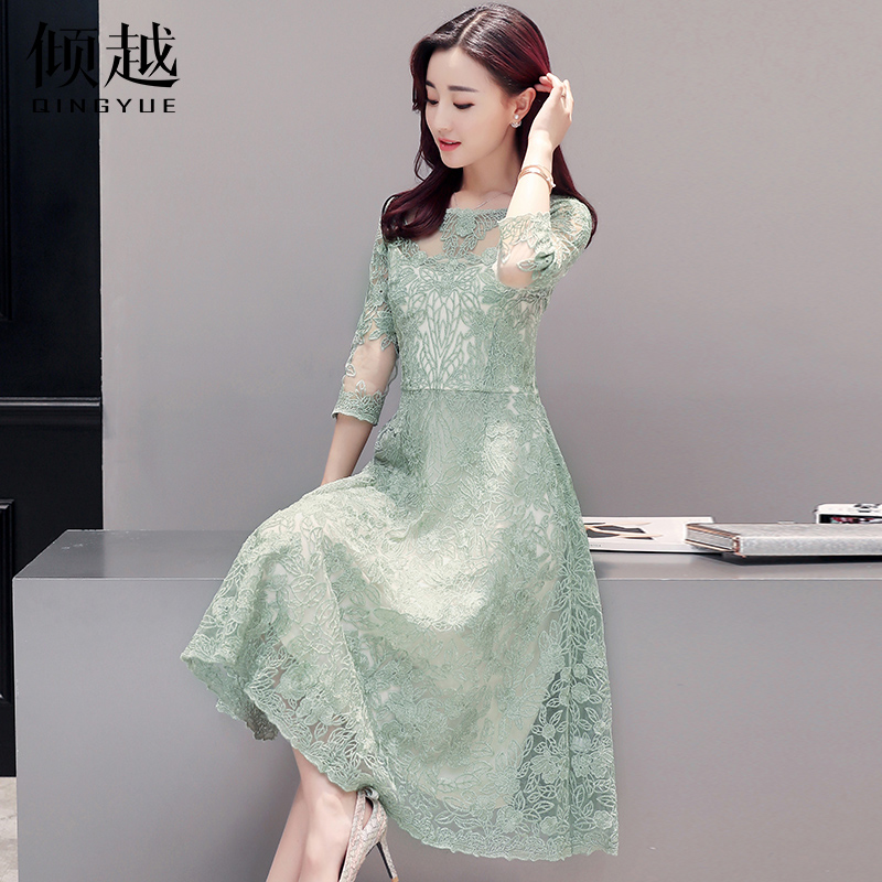 / 傾越2017春季新款韓版鏤空蕾絲裙修身中長款A字七分袖套頭連衣裙