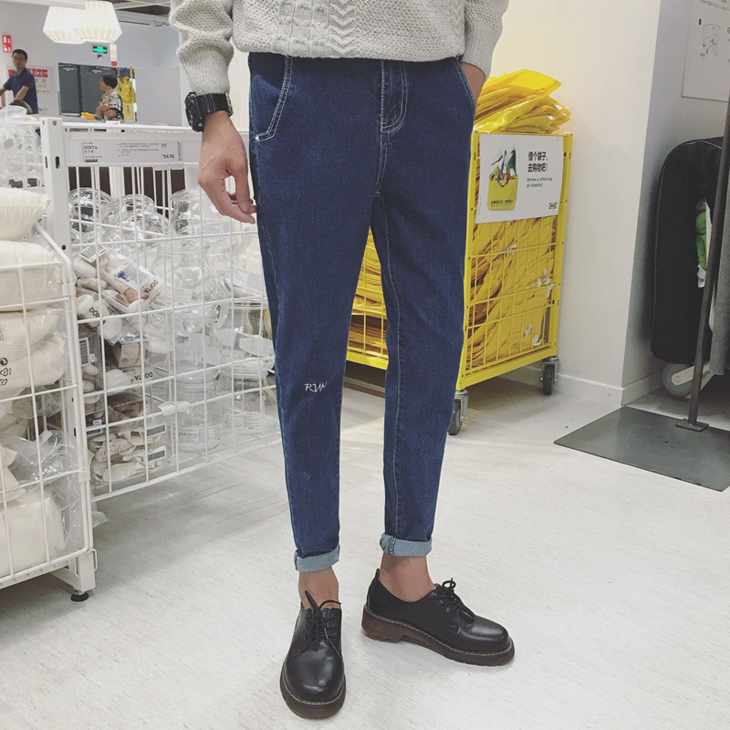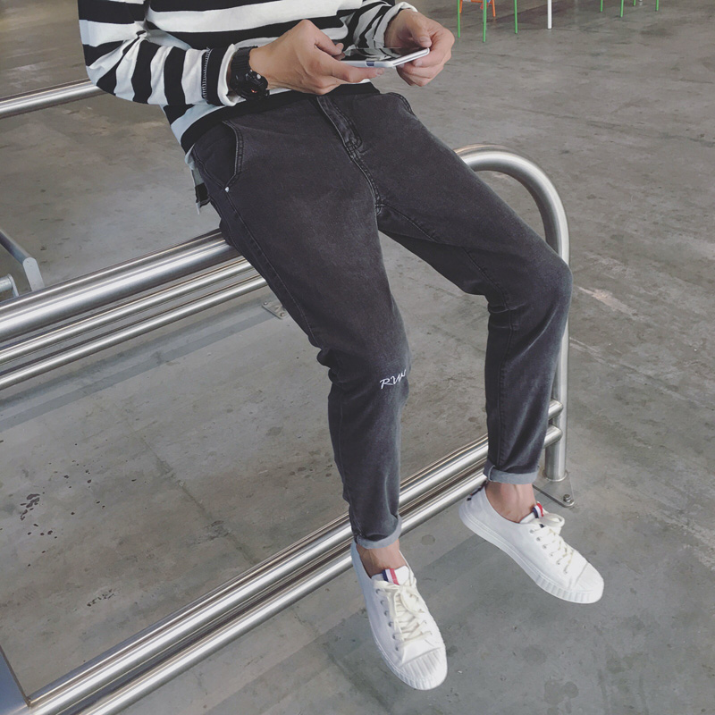 秋冬新品韓版字母刺繡休男士修身水洗小腳牛仔褲