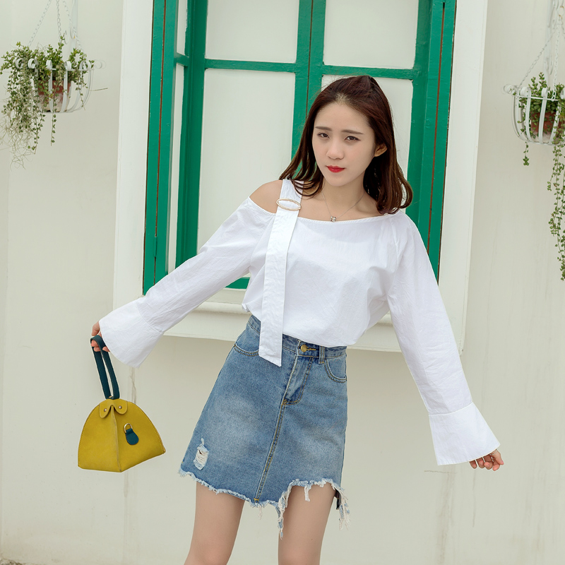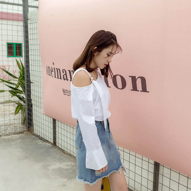 / 春夏裝新款韓版女裝學院風白色襯衫一字領露肩吊帶襯衣上衣潮