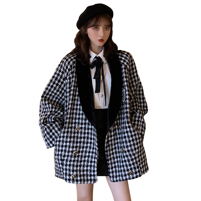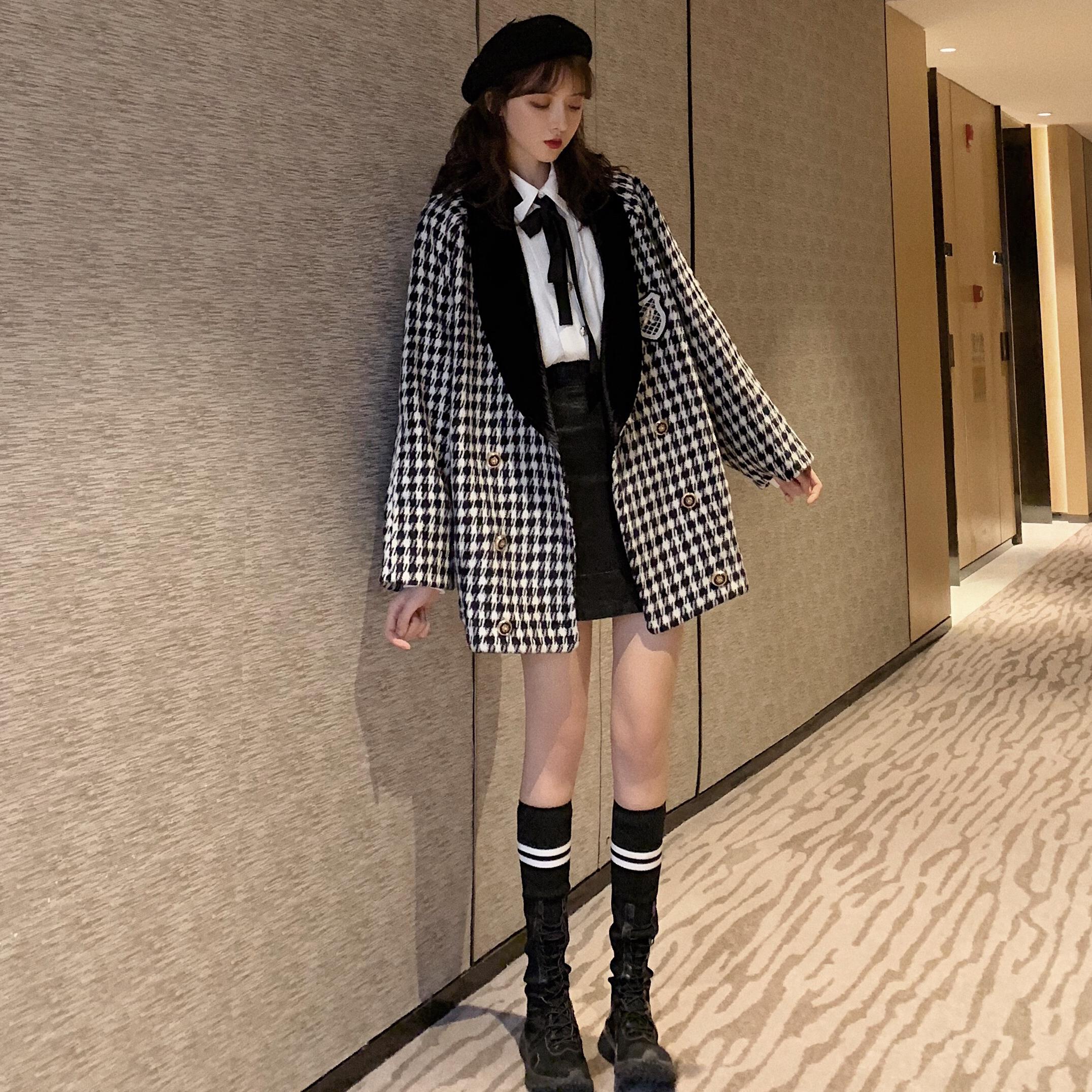 冬季新款寬松斗篷千鳥格毛呢大衣外套女領帶長袖襯衫港風時尚套裝