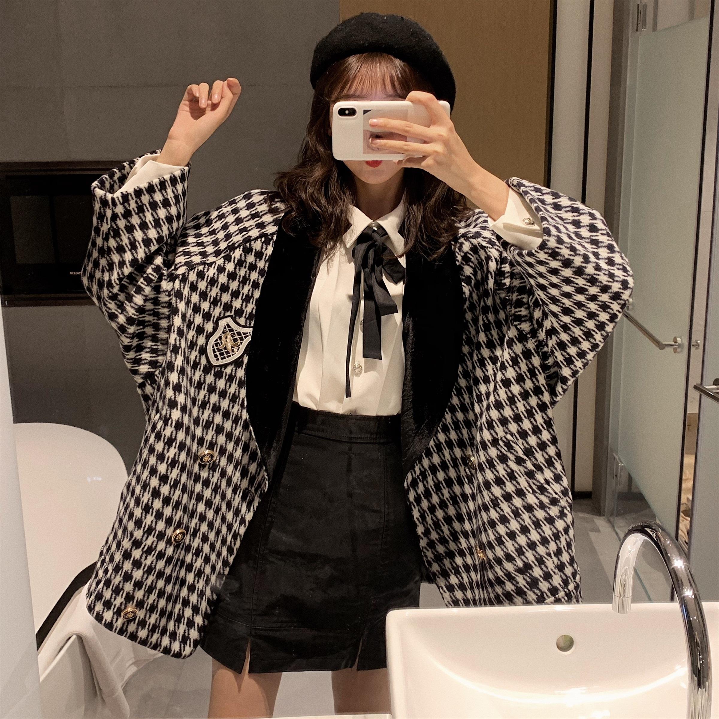 / 冬季新款寬松斗篷千鳥格毛呢大衣外套女領帶長袖襯衫港風時尚套裝