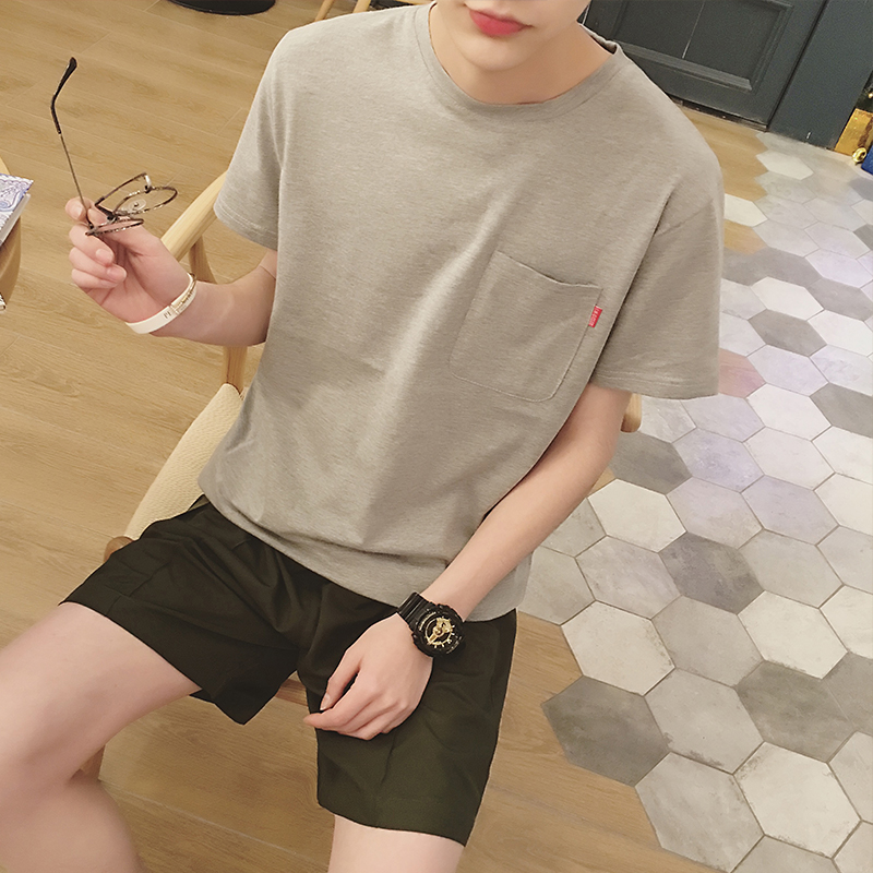 / 夏裝口袋袖標港風純色打底衫韓版男士短袖T恤