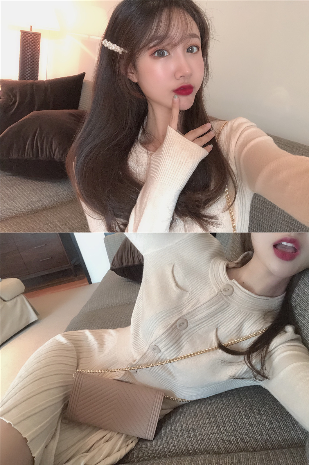 / 晚晚風秋季新款顯瘦長袖百搭修身短裙百褶裙針織拼接紐扣連衣裙女