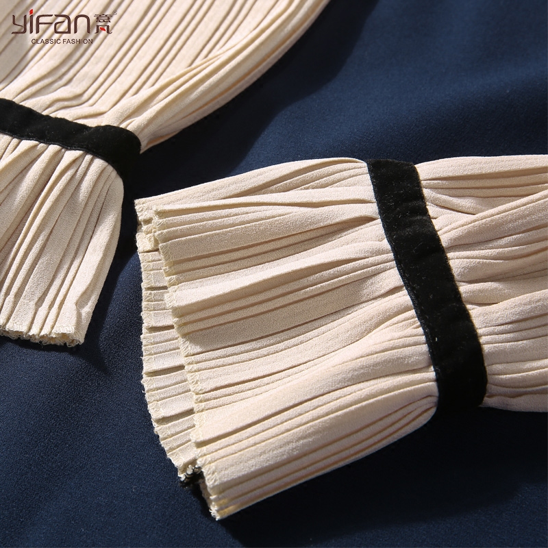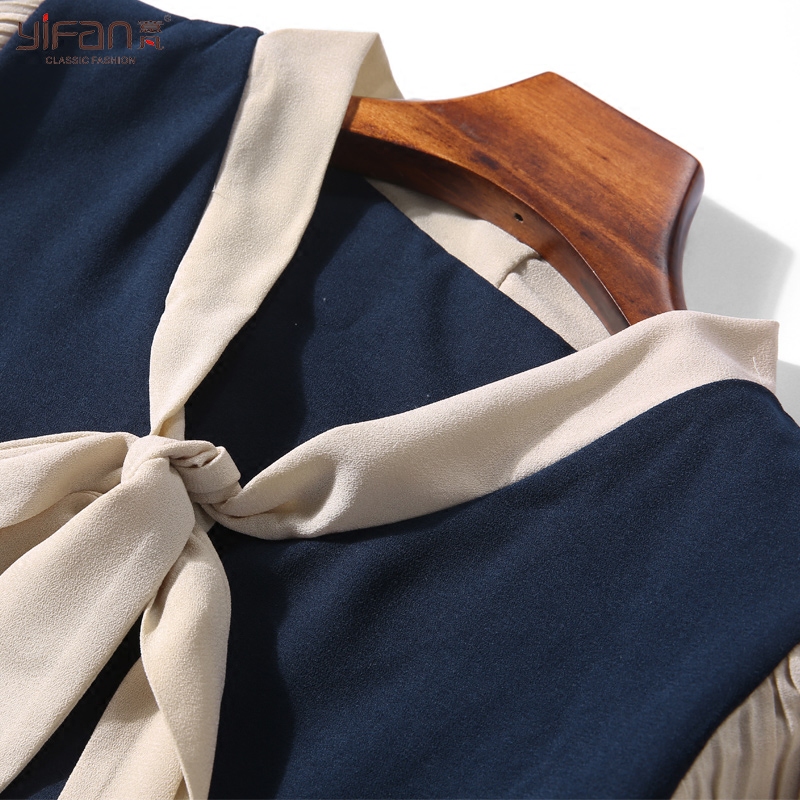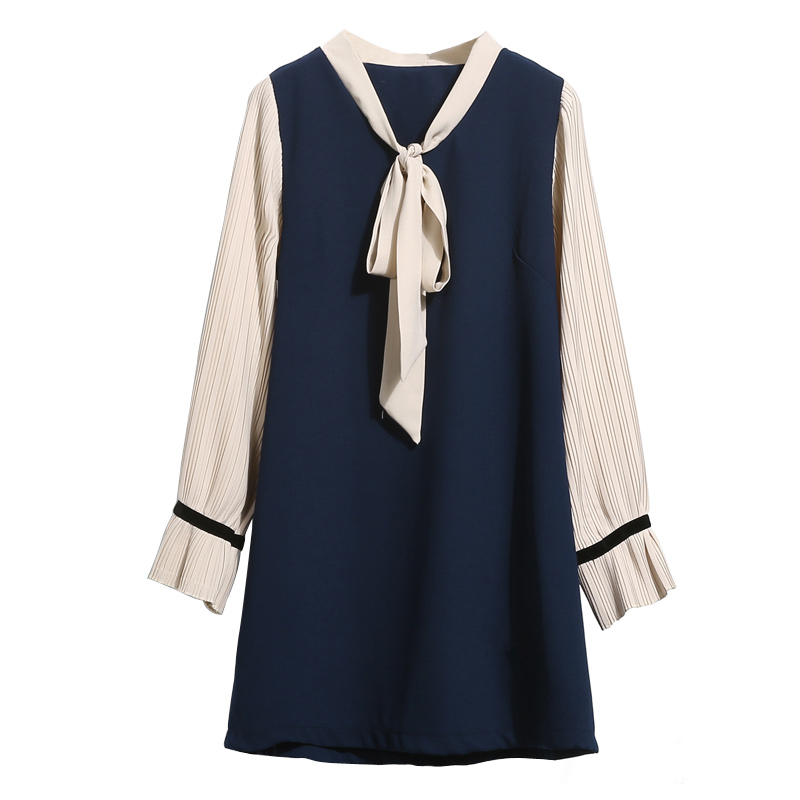 假兩件連衣裙春季時尚撞色拼接雪紡中長裙蝴蝶結領學院風裙子