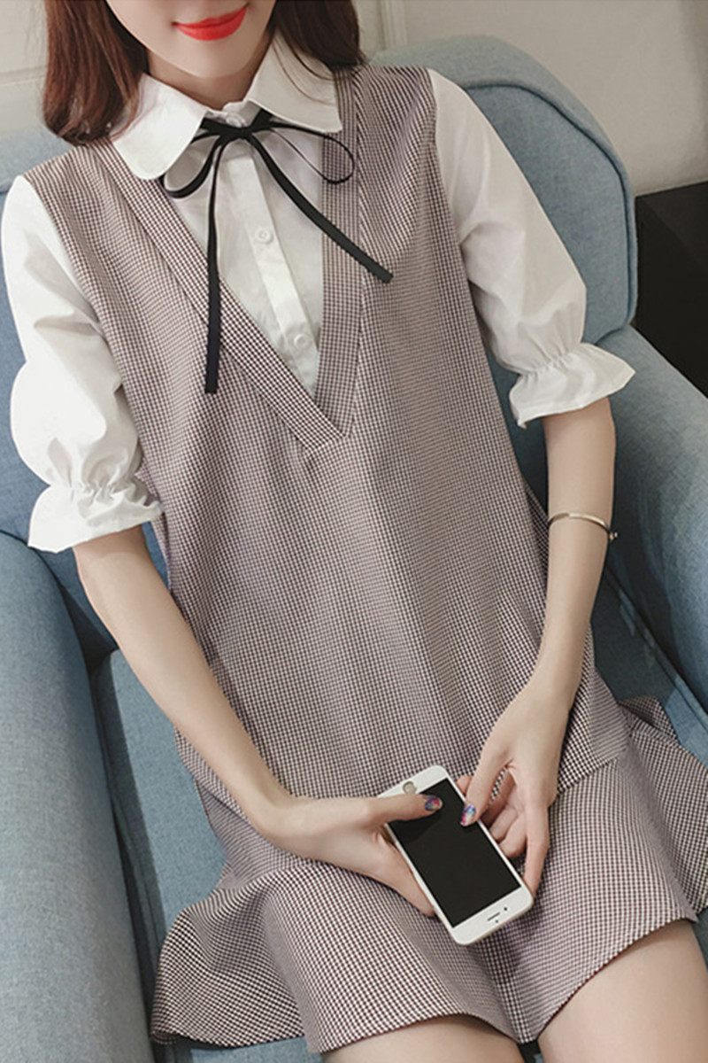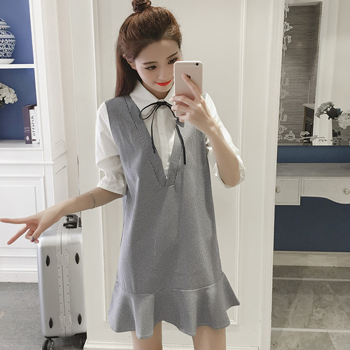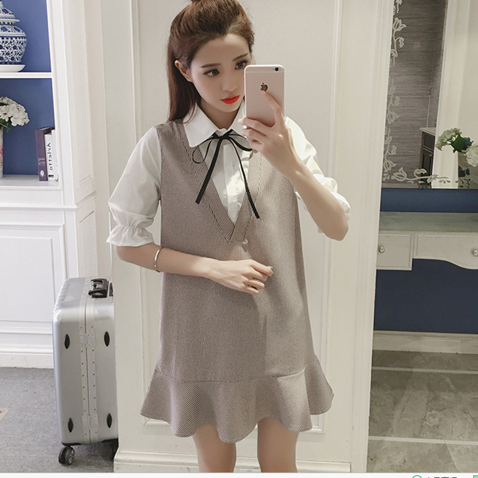 / 春夏季新款女裝韓版假兩件寬松顯瘦荷葉邊中袖格子襯衫連衣裙