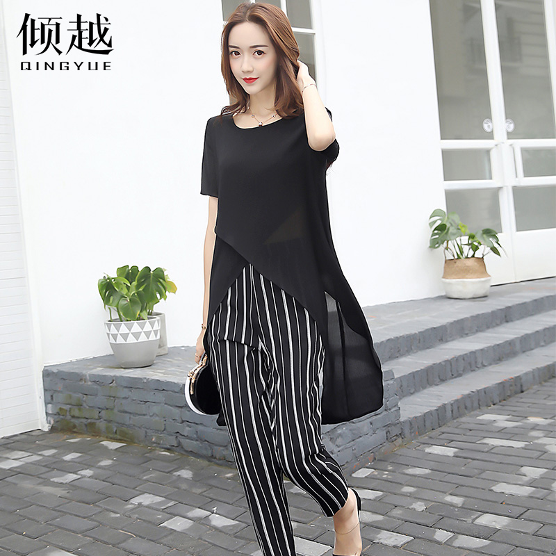 / 傾越2017新款夏季女裝復古歐洲站套裝時尚韓版條紋九分褲兩件套潮
