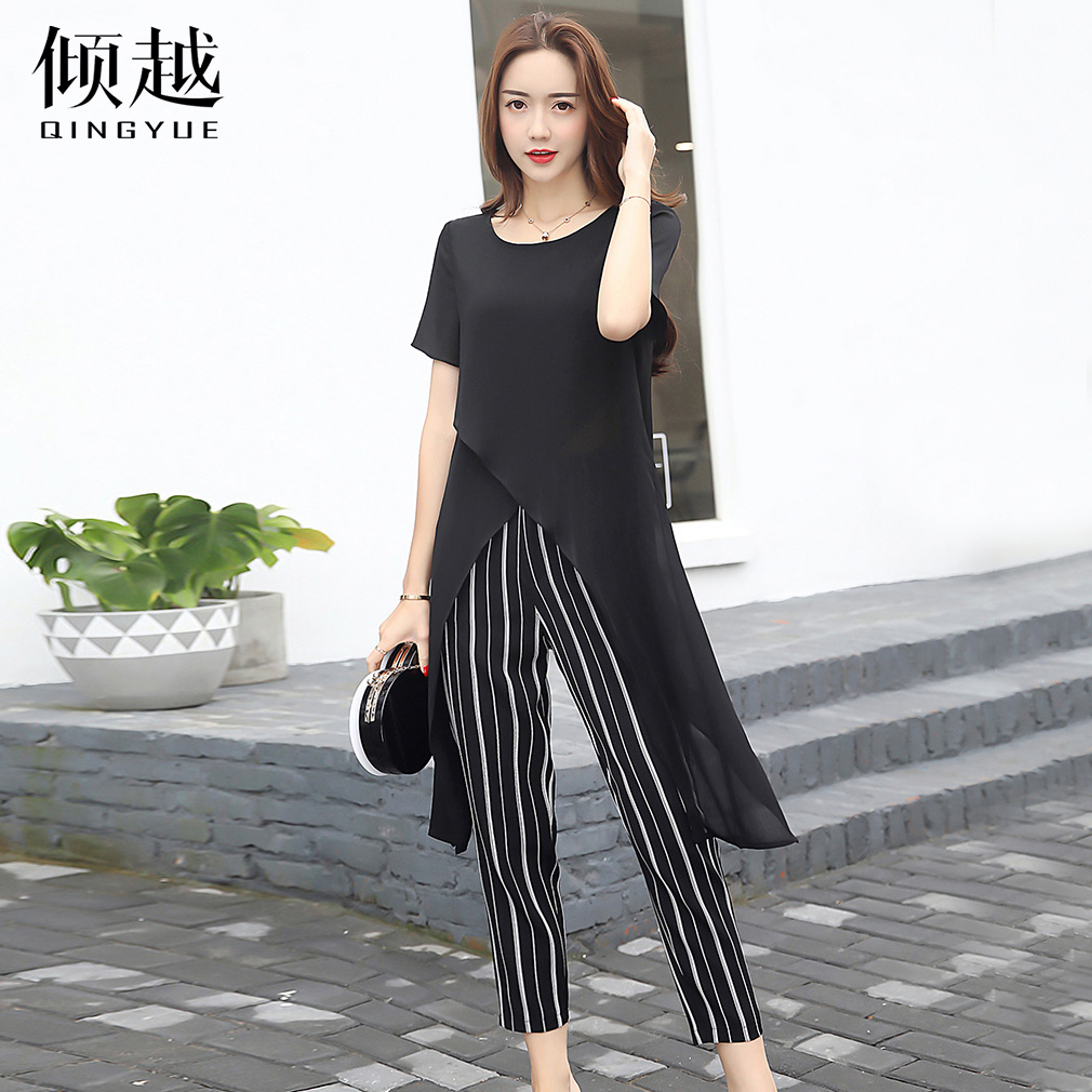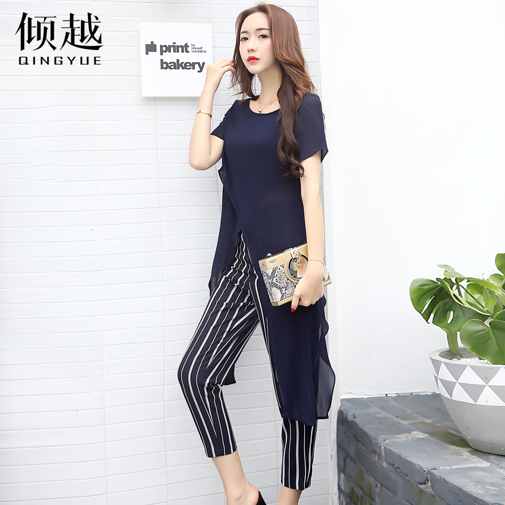 傾越2017新款夏季女裝復古歐洲站套裝時尚韓版條紋九分褲兩件套潮