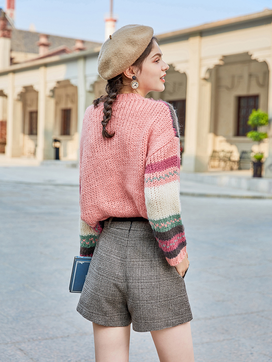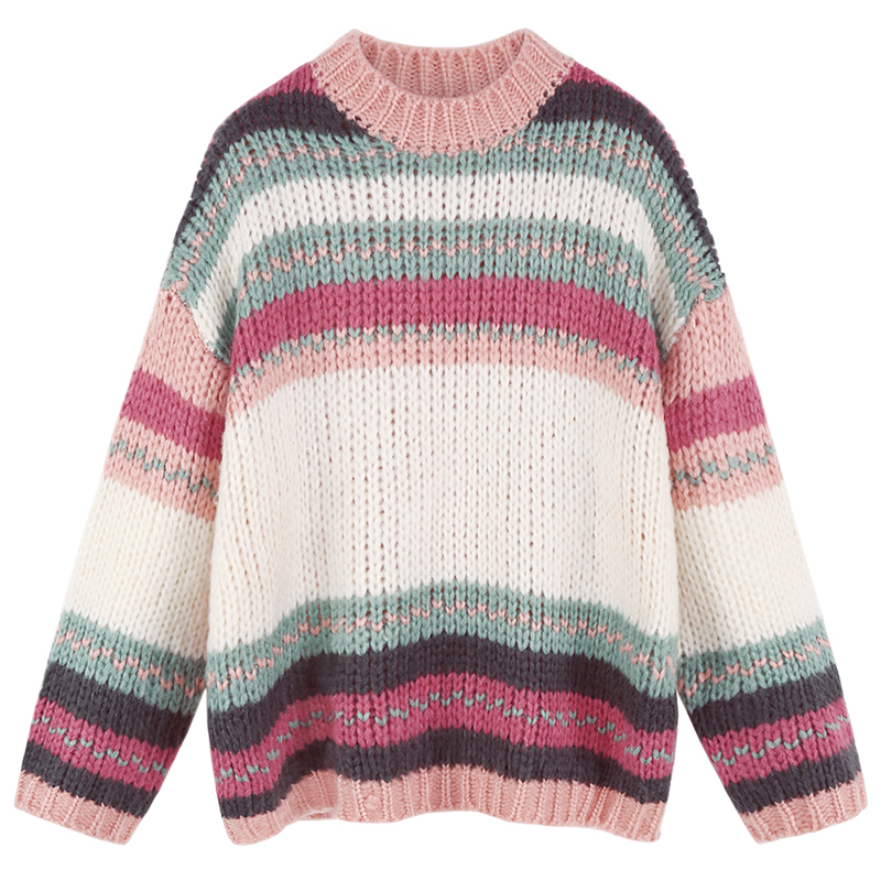 MG小象冬季慵懶風毛衣女套頭長袖2018新款寬松條紋拼色原宿風上衣