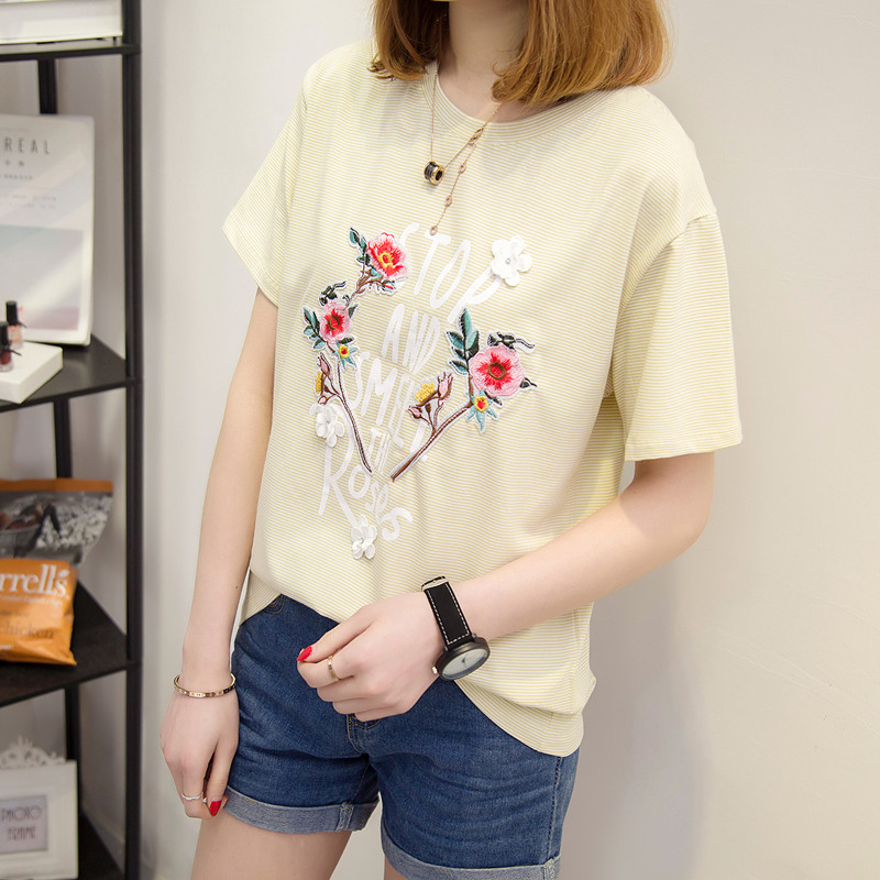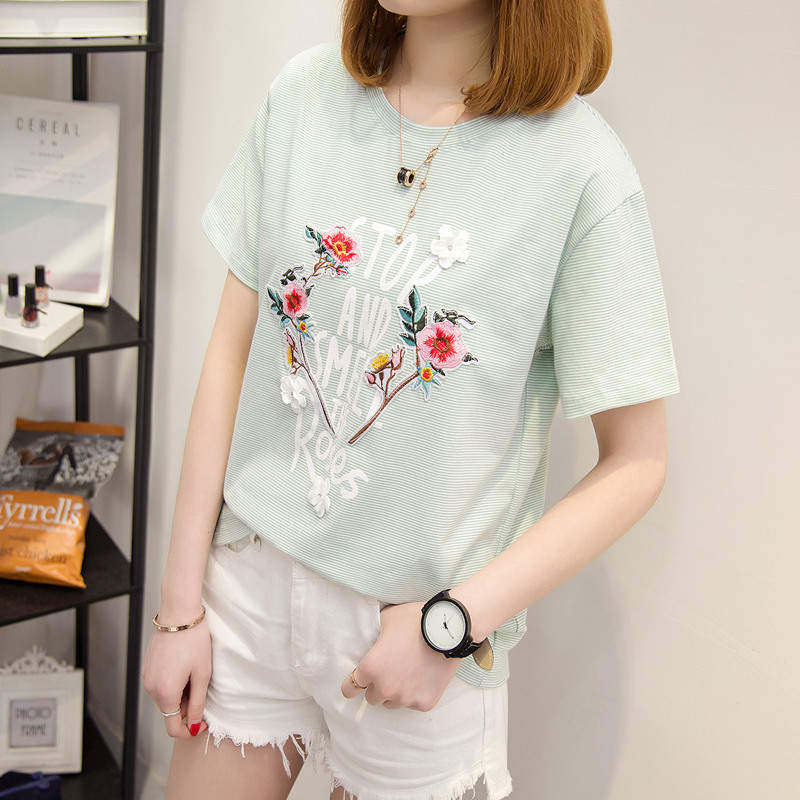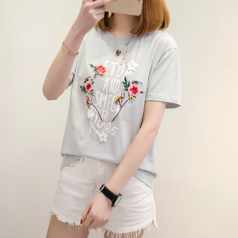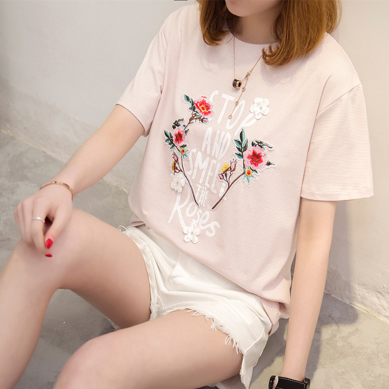 / 女裝夏裝新款潮立體刺繡花卉t恤女短袖韓版上衣女夏寬松百搭